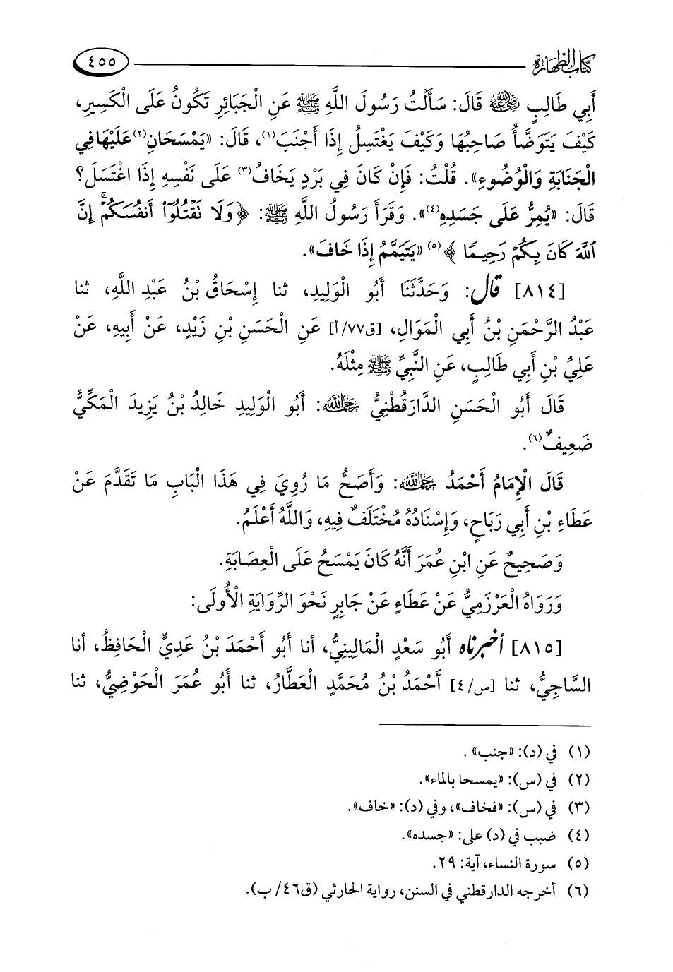 أَبِي طَالِبٍ - رضي الله عنه - قَالَ: سَأَلْتُ رَسُولَ اللَّهِ - صلى الله عليه وسلم - عَنِ الْجَبَائِرِ تَكُونُ عَلَى الْكَسِيرِ، كَيْفَ يَتَوَضَّأُ صَاحِبُهَا وَكَيْفَ يَغْتَسِلُ إِذَا أَجْنَبَ (¬1)، قَالَ: "يَمْسَحَانِ (¬2) عَلَيْهَا فِي الْجَنَابَةِ وَالْوُضُوءِ". قُلْتُ: فَإِنْ كَانَ فِي بَرْدٍ يَخَافُ (¬3) عَلَى نَفْسِهِ إِذَا اغْتَسلَ؟ قَالَ: "يُمِرُّ عَلَى جَسَدِهِ (¬4) ". وَقَرَأَ رَسُولُ اللَّهِ - صلى الله عليه وسلم -: {وَلَا تَقْتُلُوا أَنْفُسَكُمْ إِنَّ اللَّهَ كَانَ بِكُمْ رَحِيمًا} (¬5) "يَتَيَمَّمُ إِذَا خَافَ".