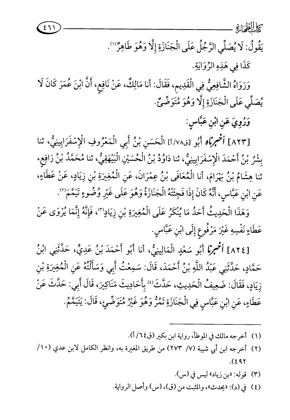 [824] أخبرنا أَبُو سَعْدٍ الْمَالِينِيُّ، أنا أَبُو أَحْمَدَ بْنُ عَدِيٍّ، حَدَّثَنِي ابْنُ حَمَّادٍ، حَدَّثَنِي عَبْدُ اللَّهِ بْنُ أَحْمَدَ، قَالَ: سَمِعْتُ أَبِي وَسَأَلْتُهُ عَنِ الْمُغِيرَةِ بْنِ زِيَادٍ، فَقَالَ: ضَعِيفُ الْحَدِيثِ، حَدَّثَ (¬4) بِأَحَادِيثَ مَنَاكِيرَ، قَالَ أَبِي: حَدَّثَ عَنْ عَطَاءٍ، عَنِ ابْنِ عَبَّاسٍ فِي الْجَنَازَةِ تَمُرُّ وَهُوَ غَيْرُ مُتَوَضِّئٍ، قَالَ: يَتَيَمَّمُ.