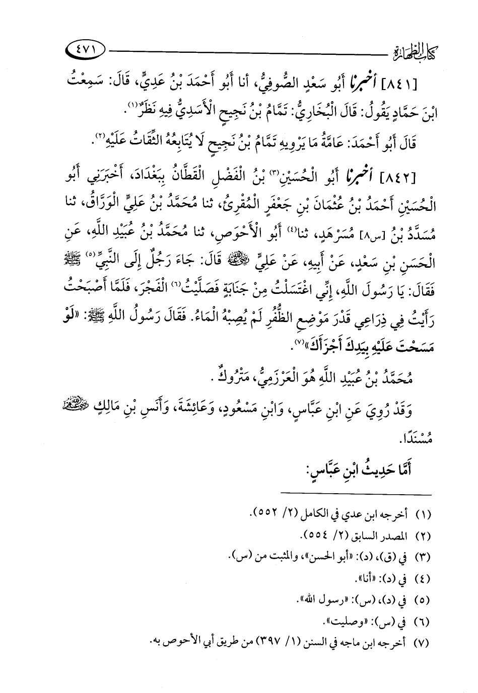 [842] أخبرنا أَبُو الْحُسَيْنِ (¬3) بْنُ الْفَضْلِ الْقَطَّانُ بِبَغْدَادَ، أَخْبَرَنِي أَبُو الْحُسَيْنِ أَحْمَدُ بْنُ عُثْمَانَ بْنِ جَعْفَرٍ الْمُقْرِئُ، ثنا مُحَمَّدُ بْنُ عَلِيٍّ الْوَرَّاقُ، ثنا مُسَدَّدُ بْنُ مُسَرْهَدٍ، ثنا (¬4) أَبُو الْأَحْوَصِ، ثنا مُحَمَّدُ بْنُ عُبَيْدِ اللَّهِ، عَنِ الْحَسَنِ بْنِ سَعْدٍ، عَنْ أَبِيهِ، عَنْ عَلِيٍّ - رضي الله عنه - قَالَ: جَاءَ رَجُلٌ إِلَى النَّبِيِّ (¬5) - صلى الله عليه وسلم - فَقَالَ: يَا رَسُولَ اللَّهِ، إِنِّي اغْتَسَلْتُ مِنْ جَنَابَةٍ فَصَلَّيْتُ (¬6) الْفَجْرَ، فَلَمَّا أَصْبَحْتُ رَأَيْتُ فِي ذِرَاعِي قَدْرَ مَوْضِعِ الظُّفُرِ لَمْ يُصِبْهُ الْمَاءُ. فَقَالَ رَسُولُ اللَّهِ - صلى الله عليه وسلم -: "لَوْ مَسَحْتَ عَلَيْهِ بِيَدِكَ أَجْزَأَكَ" (¬7).