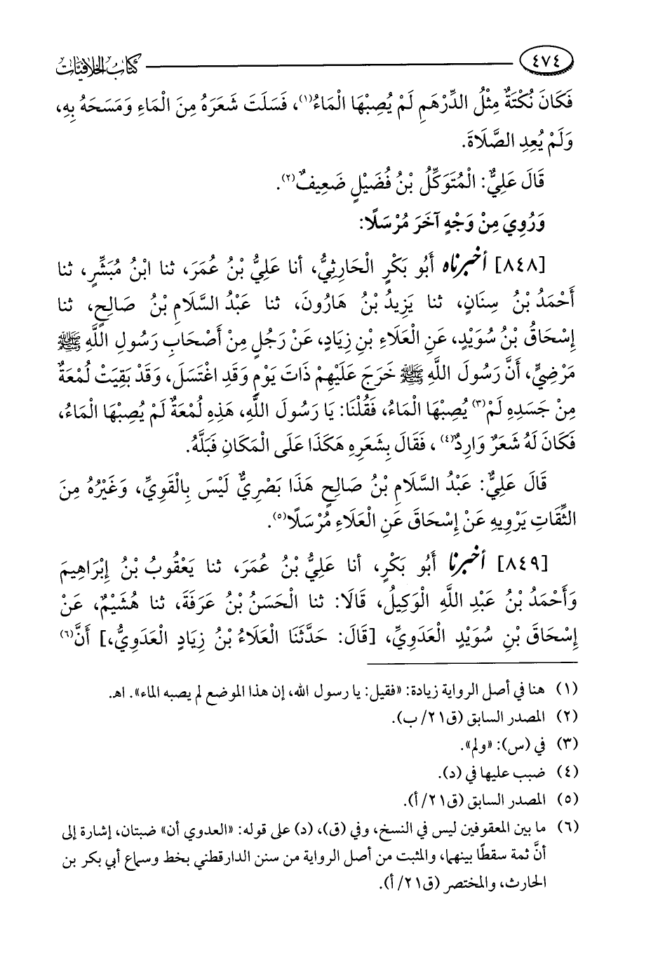 [848] أخبرناه أَبُو بَكْرٍ الْحَارِثِيُّ، أنا عَلِيُّ بْنُ عُمَرَ، ثنا ابْنُ مُبَشِّرٍ، ثنا أَحْمَدُ بْنُ سِنَانٍ، ثنا يَزِيدُ بْنُ هَارُونَ، ثنا عَبْدُ السَّلَامِ بْنُ صَالِحٍ، ثنا إِسْحَاقُ بْنُ سُوَيْدٍ، عَنِ الْعَلَاءِ بْنِ زِيَادٍ، عَنْ رَجُلٍ مِنْ أَصْحَابِ رَسُولِ اللَّهِ - صلى الله عليه وسلم - مَرْضِيٍّ، أَنَّ رَسُولَ اللَّهِ - صلى الله عليه وسلم - خَرَجَ عَلَيْهِمْ ذَاتَ يَوْمٍ وَقَدِ اغْتَسَلَ، وَقَدْ بَقِيَتْ لُمْعَةٌ مِنْ جَسَدِهِ لَمْ (¬3) يُصِبْهَا الْمَاءُ، فَقُلْنَا: يَا رَسُولَ اللَّهِ، هَذِهِ لُمْعَةٌ لَمْ يُصِبْهَا الْمَاءُ، فكَانَ لَهُ شَعَرٌ وَارِدٌ (¬4)، فَقَالَ بِشَعَرِهِ هَكَذَا عَلَى الْمَكَانِ فَبَلَّهُ.