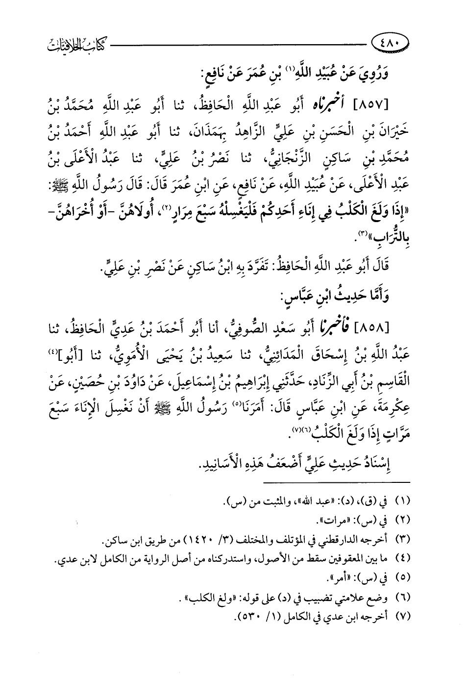 [858] فأخبرنا أَبُو سَعْدٍ الصُّوفِيُّ، أنا أَبُو أَحْمَدَ بْنُ عَدِيٍّ الْحَافِظُ، ثنا عَبْدُ اللَّهِ بْنُ إِسْحَاقَ الْمَدَائِنِيُّ، ثنا سَعِيدُ بْنُ يَحْيَى الْأُمَوِيُّ، ثنا [أَبُو] (¬4) الْقَاسِمِ بْنُ أَبِي الزِّنَادِ، حَدَّثَنِي إِبْرَاهِيمُ بْنُ إِسْمَاعِيلَ، عَنْ دَاوُدَ بْنِ حُصَيْنٍ، عَنْ عِكْرِمَةَ، عَنِ ابْنِ عَبَّاسٍ قَالَ: أَمَرَنَا (¬5) رَسُولُ اللَّهِ - صلى الله عليه وسلم - أَنْ نَغْسِلَ الْإِنَاءَ سَبْعَ مَرَّاتٍ إِذَا وَلَغَ الْكَلْبُ (¬6) (¬7).
