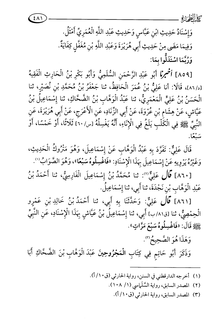 [861] قال عَلِيٌّ: وَحَدَّثَنَا بِهِ أَبِي، ثنا أَحْمَدُ بْنُ خَالِدِ بْنِ عَمْرٍو الْحِمْصِيُّ، ثنا أَبِي، ثنا إِسْمَاعِيلُ بْنُ عَيَّاشٍ بِهَذَا الْإِسْنَادِ، عَنِ النَّبِيِّ - صلى الله عليه وسلم - قَالَ: "فَاغْسِلُوهُ سَبْعَ مَرَّاتٍ".