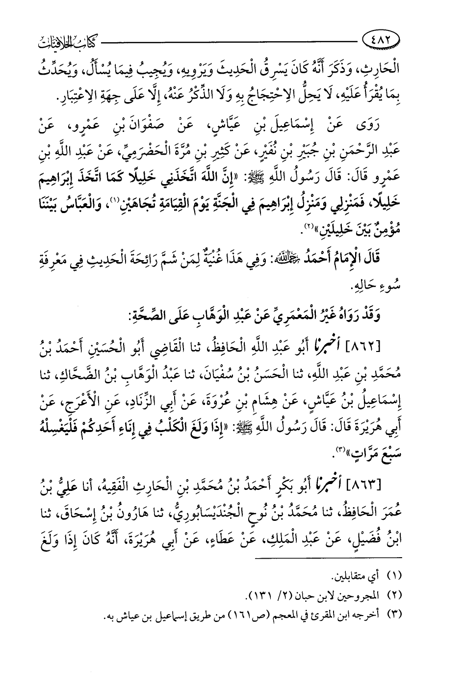 [862] أخبرنا أَبُو عَبْدِ اللَّهِ الْحَافِظُ، ثنا الْقَاضِي أَبُو الْحُسَيْنِ أَحْمَدُ بْنُ مُحَمَّدِ بْنِ عَبْدِ اللَّهِ، ثنا الْحَسَنُ بْنُ سُفْيَانَ، ثنا عَبْدُ الْوَهَّابِ بْنُ الضَّحَّاكِ، ثنا إِسْمَاعِيلُ بْنُ عَيَّاشٍ، عَنْ هِشَامِ بْنِ عُرْوَةَ، عَنْ أَبِي الزِّنَادِ، عَنِ الْأَعْرَجِ، عَنْ أَبِي هُرَيْرَةَ قَالَ: قَالَ رَسُولُ اللَّهِ - صلى الله عليه وسلم -: "إِذَا وَلَغَ الْكَلْبُ فِي إِنَاءِ أَحَدِكُمْ فَلْيَغْسِلْهُ سَبْعَ مَرَّاتٍ" (¬3).