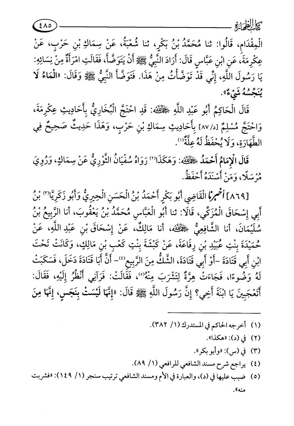 [869] أخبرنا الْقَاضِي أَبُو بَكْرٍ أَحْمَدُ بْنُ الْحَسَنِ الْحِيرِيُّ وَأَبُو زَكَرِيَّا (¬3) بْنُ أَبِي إِسْحَاقَ الْمُزَكِّي، قَالَا: ثنا أَبُو الْعَبَّاسِ مُحَمَّدُ بْنُ يَعْقُوبَ، أنا الرَّبِيعُ بْنُ سُلَيْمَانَ، أنا الشَّافِعِيُّ - رحمه الله -، أنا مَالِكٌ، عَنْ إِسحَاقَ بْنِ عَبْدِ اللَّهِ، عَنْ حُمَيْدَةَ بِنْتِ عُبَيْدِ بْنِ رِفَاعَةَ، عَنْ كَبْشَةَ بِنْتِ كَعْبِ بْنِ مَالِكٍ، وَكَانَتْ تَحْتَ ابْنِ أَبِي قَتَادَةَ - أَوْ أَبِي قَتَادَةَ، الشَّكُّ مِنَ الرَّبِيعِ (¬4) - أَنَّ أَبَا قَتَادَةَ دَخَلَ، فَسَكَبَتْ لَهُ وَضُوءًا، فَجَاءَتْ هِرَّةٌ لِتَشْرَبَ مِنْهُ (¬5)، فَقَالَتْ: فَرَآنِي أَنْظُرُ إِلَيْهِ، فَقَالَ: أَتَعْجَبِينَ يَا ابْنَةَ أَخِي؟ إِنَّ رَسُولَ اللَّهِ - صلى الله عليه وسلم - قالَ: "إِنَّهَا لَيْسَتْ بِنَجَسٍ، إِنَّهَا مِنَ