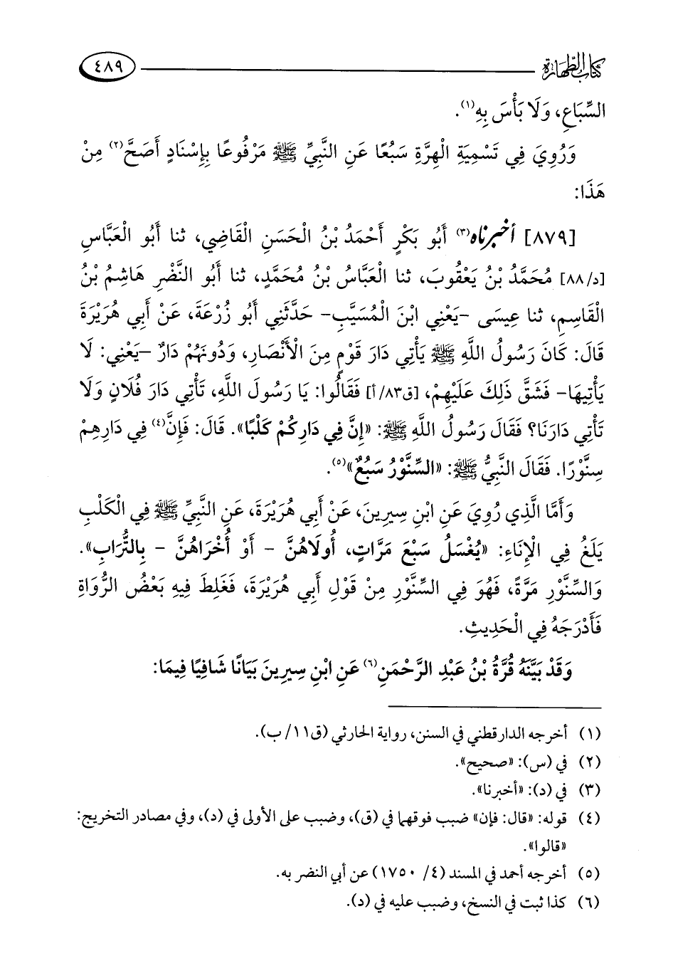 [879] أخبرناه (¬3) أَبُو بَكْرٍ أَحْمَدُ بْنُ الْحَسَنِ الْقَاضِي، ثنا أَبُو الْعَبَّاسِ مُحَمَّدُ بْنُ يَعْقُوبَ، ثنا الْعَبَّاسُ بْنُ مُحَمَّدٍ، ثنا أَبُو النَّضْرِ هَاشِمُ بْنُ الْقَاسِمِ، ثنا عِيسَى - يَعْنِي ابْنَ الْمُسَيَّبِ - حَدَّثَنِي أَبُو زُرْعَةَ، عَنْ أَبِي هُرَيْرَةَ قَالَ: كَانَ رَسُولُ اللَّهِ - صلى الله عليه وسلم - يأْتِي دَارَ قَوْمٍ مِنَ الْأَنْصَارِ، وَدُونَهُمْ دَارٌ - يَعْنِي: لَا يَأْتِيهَا - فَشَقَّ ذَلِكَ عَلَيْهِمْ، فَقَالُوا: يَا رَسُولَ اللَّهِ، تَأْتِي دَارَ فُلَانٍ وَلَا تَأْتِي دَارَنَا؟ فَقَالَ رَسُولُ اللَّهِ - صلى الله عليه وسلم -: "إِنَّ فِي دَارِكُمْ كَلْبًا". قَالَ: فَإِنَّ (¬4) فِي دَارِهِمْ سِنَّوْرًا. فَقَالَ النَّبِيُّ - صلى الله عليه وسلم -: "السِّنَّوْرُ سَبُعٌ" (¬5).