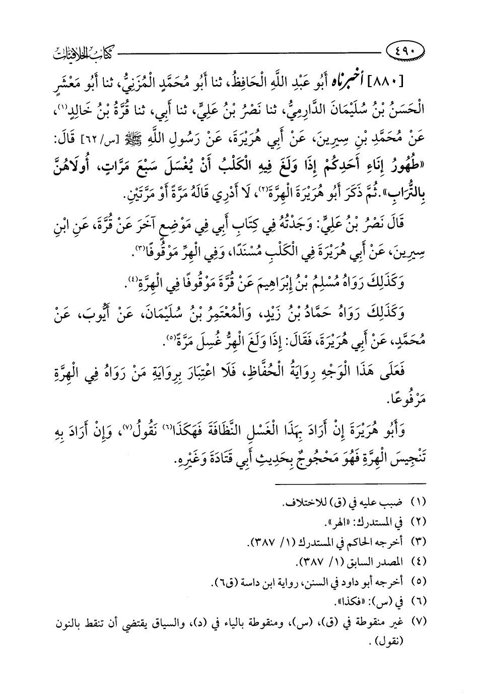 [880] أخبرناه أَبُو عَبْدِ اللَّهِ الْحَافِظُ، ثنا أَبُو مُحَمَّدٍ الْمُزَنِيُّ، ثنا أَبُو مَعْشَرٍ الْحَسَنُ بْنُ سُلَيْمَانَ الدَّارِمِيُّ، ثنا نَصْرُ بْنُ عَلِيٍّ، ثنا أَبِي، ثنا قُرَّةُ بْنُ خَالِدٍ (¬1)، عَنْ مُحَمَّدِ بْنِ سِيرِينَ، عَنْ أَبِي هُرَيْرَةَ، عَنْ رَسُولِ اللَّهِ - صلى الله عليه وسلم - قَالَ: "طُهُورُ إِنَاءِ أَحَدِكُمْ إِذَا وَلَغَ فِيهِ الْكَلْبُ أَنْ يُغْسَلَ سَبْعَ مَرَّاتٍ، أُولَاهُنَّ بِالتُّرَابِ". ثُمَّ ذَكَرَ أَبُو هُرَيْرَةَ الْهِرَّةَ (¬2)، لَا أَدْرِي قَالَهُ مَرَّةً أَوْ مَرَّتَيْنِ.
