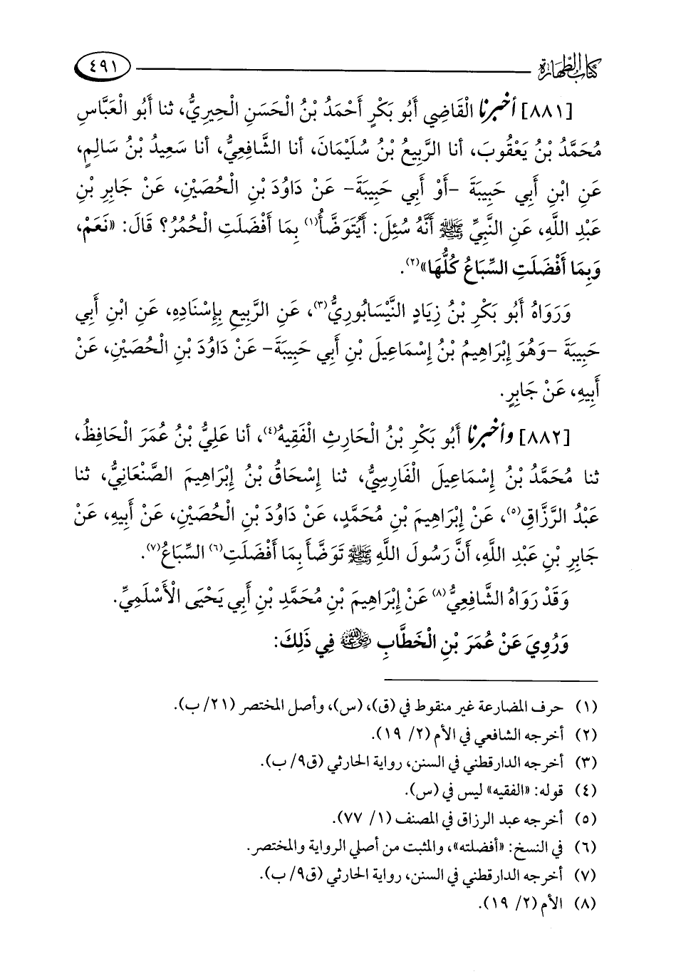 [881] أخبرنا الْقَاضِي أَبُو بَكْرٍ أَحْمَدُ بْنُ الْحَسَنِ الْحِيرِيُّ، ثنا أَبُو الْعَبَّاسِ مُحَمَّدُ بْنُ يَعْقُوبَ، أنا الرَّبِيعُ بْنُ سُلَيْمَانَ، أنا الشَّافِعِيُّ، أنا سَعِيدُ بْنُ سَالِمٍ، عَنِ ابْنِ أَبِي حَبِيبَةَ - أَوْ أَبِي حَبِيبَةَ - عَنْ دَاوُدَ بْنِ الْحُصَيْنِ، عَنْ جَابِرِ بْنِ عَبْدِ اللَّهِ، عَنِ النَّبِيِّ - صلى الله عليه وسلم - أَنَّهُ سُئِلَ: أَيُتَوَضَّأُ (¬1) بِمَا أَفْضَلَتِ الْحُمُرُ؟ قَالَ: "نَعَمْ، وَبِمَا أَفْضَلَتِ السِّبَاعُ كُلُّهَا" (¬2).