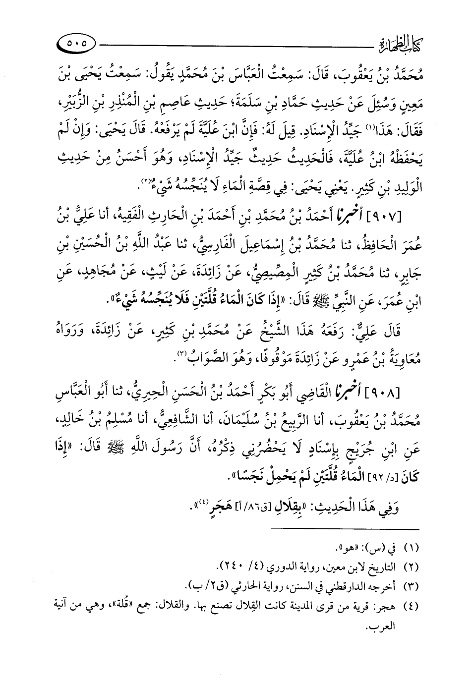 مُحَمَّدُ بْنُ يَعْقُوبَ، قَالَ: سَمِعْتُ الْعَبَّاسَ بْنَ مُحَمَّدٍ يَقُولُ: سَمِعْتُ يَحْيَى بْنَ مَعِينٍ وَسُئِلَ عَنْ حَدِيثِ حَمَّادِ بْنِ سَلَمَةَ؛ حَدِيثِ عَاصِمِ بْنِ الْمُنْذِرِ بْنِ الزُّبَيْرِ، فَقَالَ: هَذَا (¬1) جَيِّدُ الْإِسْنَادِ. قِيلَ لَهُ: فَإِنَّ ابْنَ عُلَيَّةَ لَمْ يَرْفَعْهُ. قَالَ يَحْيَى: وَإِنْ لَمْ يَحْفَظْهُ ابْنُ عُلَيَّةَ، فَالْحَدِيثُ حَدِيثٌ جَيِّدُ الْإِسْنَادِ، وَهُوَ أَحْسَنُ مِنْ حَدِيثِ الْوَلِيدِ بْنِ كَثِيرٍ. يَعْنِي يَحْيَى: فِي قِصَّةِ الْمَاءِ لَا يُنَجِّسُهُ شَيْءٌ (¬2).