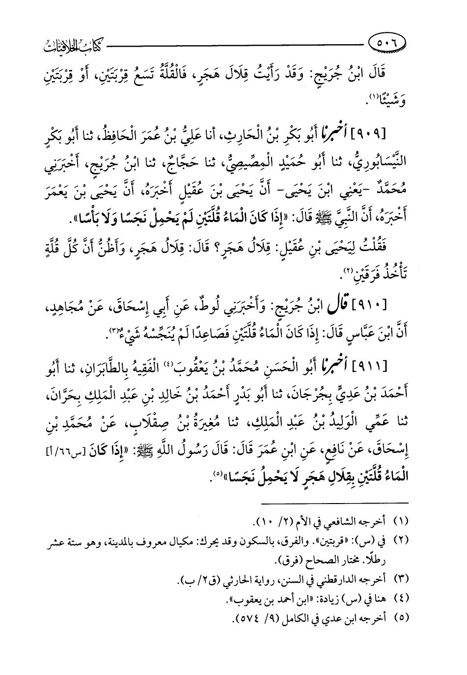 [909] أخبرنا أَبُو بَكْرِ بْنُ الْحَارِثِ، أنا عَلِيُّ بْنُ عُمَرَ الْحَافِظُ، ثنا أَبُو بَكْرٍ النَّيْسَابُورِيُّ، ثنا أَبُو حُمَيْدٍ الْمِصِّيصِيُّ، ثنا حَجَّاجٌ، ثنا ابْنُ جُرَيْجٍ، أَخْبَرَنِي مُحَمَّدٌ - يَعْنِي ابْنَ يَحْيَى - أَنَّ يَحْيَى بْنَ عُقَيْلٍ أَخْبَرَهُ، أَنَّ يَحْيَى بْنَ يَعْمَرَ أَخْبَرَهُ، أَنَّ النَّبِيَّ - صلى الله عليه وسلم - قَالَ: "إِذَا كَانَ الْمَاءُ قُلَّتَيْنِ لَمْ يَحْمِلْ نَجَسًا وَلَا بَأْسًا".