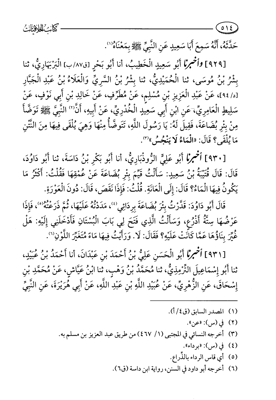 [929] وأخبرنا أَبُو سَعِيدٍ الْخَطِيبُ، أنا أَبُو بَحْرٍ الْبَرْبَهَارِيُّ، ثنا بِشْرُ بْنُ مُوسَى، ثنا الْحُمَيْدِيُّ، ثنا بِشْرُ بْنُ السَّرِيِّ وَالْعَلَاءُ بْنُ عَبْدِ الْجَبَّارِ, عَنْ عَبْدِ الْعَزِيزِ بْنِ مُسْلِمٍ، عَنْ مُطَرِّفٍ، عَنْ خَالِدِ بْنِ أَبِي نَوْفٍ، عَنْ سَلِيطٍ الْعَامِرِيِّ، عَنِ ابْنِ أَبِي سَعِيدٍ الْخُدْرِيِّ، عَنْ أَبِيهِ، أَنَّ (¬2) النَّبِيَّ - صلى الله عليه وسلم - توَضَّأَ مِنْ بِئْرِ بُضَاعَةَ، فَقِيلَ لَهُ: يَا رَسُولَ اللَّهِ، تَتَوضَّأُ مِنْهَا وَهِيَ يُلْقَى فِيهَا مِنَ النَّتْنِ مَا يُلْقَى؟ قَالَ: "الْمَاءُ لَا يَنْجُسُ" (¬3).