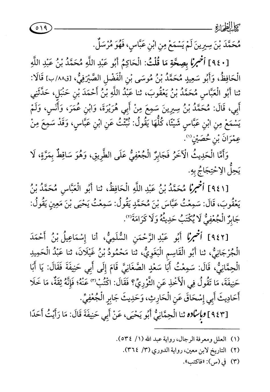 [941] أخبرنا مُحَمَّدُ بْنُ عَبْدِ اللَّهِ الْحَافِظُ، ثنا أَبُو الْعَبَّاسِ مُحَمَّدُ بْنُ يَعْقُوبَ، قَالَ: سَمِعْتُ عَبَّاسَ بْنَ مُحَمَّدٍ يَقُولُ: سَمِعْتُ يَحْيَى بْنَ مَعِينٍ يَقُولُ: جَابِرٌ الْجُعْفِيُّ لَا يُكْتَبُ حَدِيثُهُ وَلَا كَرَامَةَ (¬2).