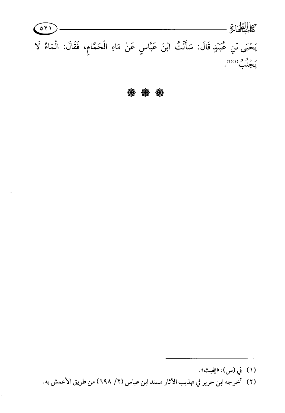 يَحْيَى بْنِ عُبَيْدٍ قَالَ: سَأَلْتُ ابْنَ عَبَّاسٍ عَنْ مَاءِ الْحَمَّامِ، فَقَالَ: الْمَاءُ لَا يَجْنُبُ (¬1) (¬2).
