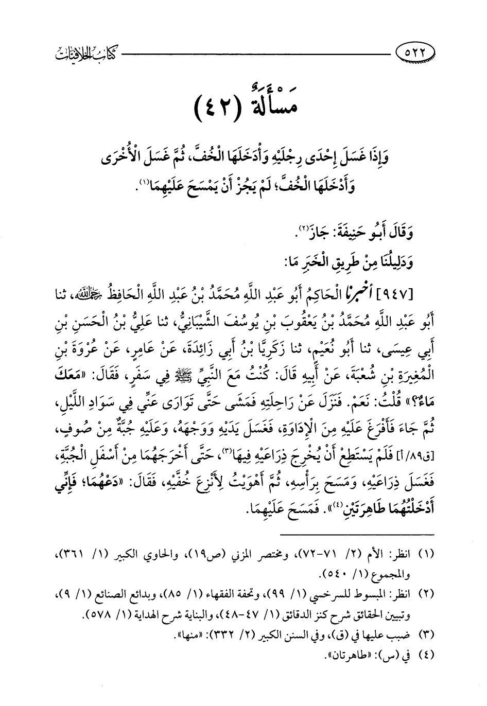 مَسْأَلَةٌ (42): وَإِذَا غَسَلَ إِحْدَى رِجْلَيْهِ وَأْدَخَلَهَا الْخُفَّ، ثُمَّ غَسَلَ الْأُخْرَى وَأَدْخَلَهَا الْخُفَّ؛ لَمْ يَجُزْ أَنْ يَمْسَحَ عَلَيْهِمَا (¬1).