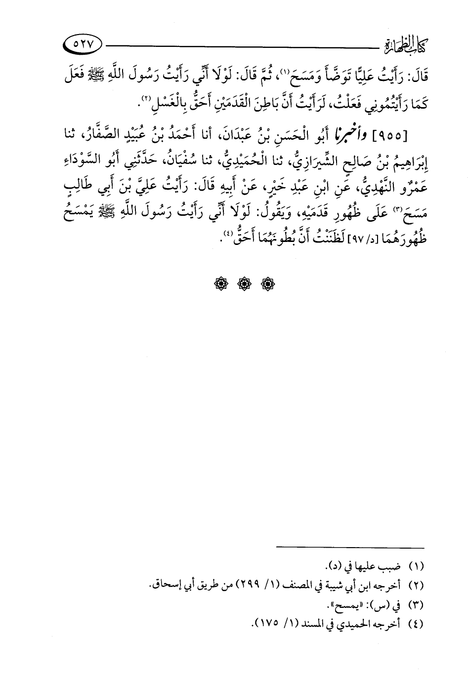 [955] وأخبرنا أَبُو الْحَسَنِ بْنُ عَبْدَانَ، أنا أَحْمَدُ بْنُ عُبَيْدٍ الصَّفَّارُ، ثنا إِبْرَاهِيمُ بْنُ صَالِحٍ الشِّيرَازِيُّ، ثنا الْحُمَيْدِيُّ، ثنا سُفْيَانُ، حَدَّثَنِي أَبُو السَّوْدَاءِ عَمْرٌو النَّهْدِيُّ، عَنِ ابْنِ عَبْدِ خَيْرٍ، عَنْ أَبِيهِ قَالَ: رَأَيْتُ عَلِيَّ بْنَ أَبِي طَالِبٍ مَسَحَ (¬3) عَلَى ظُهُورِ قَدَمَيْهِ، وَيَقُولُ: لَوْلَا أَنِّي رَأَيْتُ رَسولَ اللَّهِ - صلى الله عليه وسلم - يَمْسَحُ ظُهُورَهُمَا لَظَنَنْتُ أَنَّ بُطُونَهُمَا أَحَقُّ (¬4).