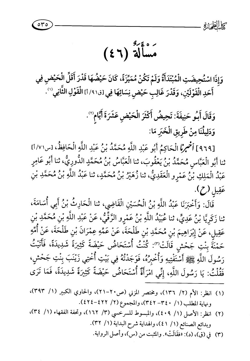 قَالَ: وَأَخْبَرَنَا عَبْدُ اللَّهِ بْنُ الْحُسَيْنِ الْقَاضِي، ثنا الْحَارِثُ بْنُ أَبِي أُسَامَةَ، ثنا زَكَرِيَّا بْنُ عَدِيٍّ، ثنا عُبَيْدُ اللَّهِ بْنُ عَمْرٍو الرَّقِّيُّ، عَنْ عَبْدِ اللَّهِ بْنِ مُحَمَّدِ بْنِ عَقِيلٍ، عَنْ إِبْرَاهِيمَ بْنِ مُحَمَّدِ بْنِ طَلْحَةَ، عَنْ عَمِّهِ عِمْرَانَ بْنِ طَلْحَةَ، عَنْ أُمِّهِ حَمْنَةَ بِنْتِ جَحْشٍ قَالَتْ (¬3): كُنْتُ أُسْتَحَاضُ حَيْضَةً كَثِيرَةً شَدِيدَةً، فَأَتَيْتُ رَسُولَ اللَّهِ - صلى الله عليه وسلم - أَسْتَفْتِيهِ وَأُخْبِرُهُ، فَوَجَدْتُهُ فِي بَيْتِ أُخْتِي زَيْنَبَ بِنْتِ جَحْشٍ، فَقُلْتُ: يَا رَسُولَ اللَّهِ، إِنِّي امْرَأَةٌ أُسْتَحَاضُ حَيْضَةً كَثِيرَةً شَدِيدَةً، فَمَا تَرَى