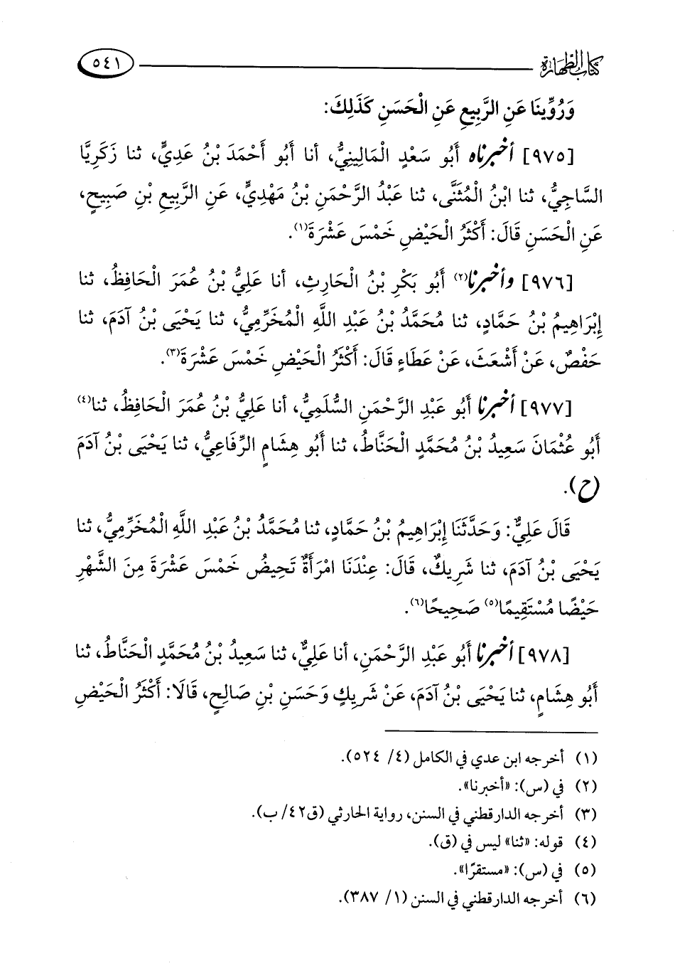 [975] أخبرناه أَبُو سَعْدٍ الْمَالِينِيُّ، أنا أَبُو أَحْمَدَ بْنُ عَدِيٍّ، ثنا زَكَرِيَّا السَّاجِيُّ، ثنا ابْنُ الْمُثَنَّى، ثنا عَبْدُ الرَّحْمَنِ بْنُ مَهْدِيٍّ، عَنِ الرَّبِيعِ بْنِ صَبِيحٍ، عَنِ الْحَسَنِ قَالَ: أَكْثَرُ الْحَيْضِ خَمْسَ عَشْرَةَ (¬1).