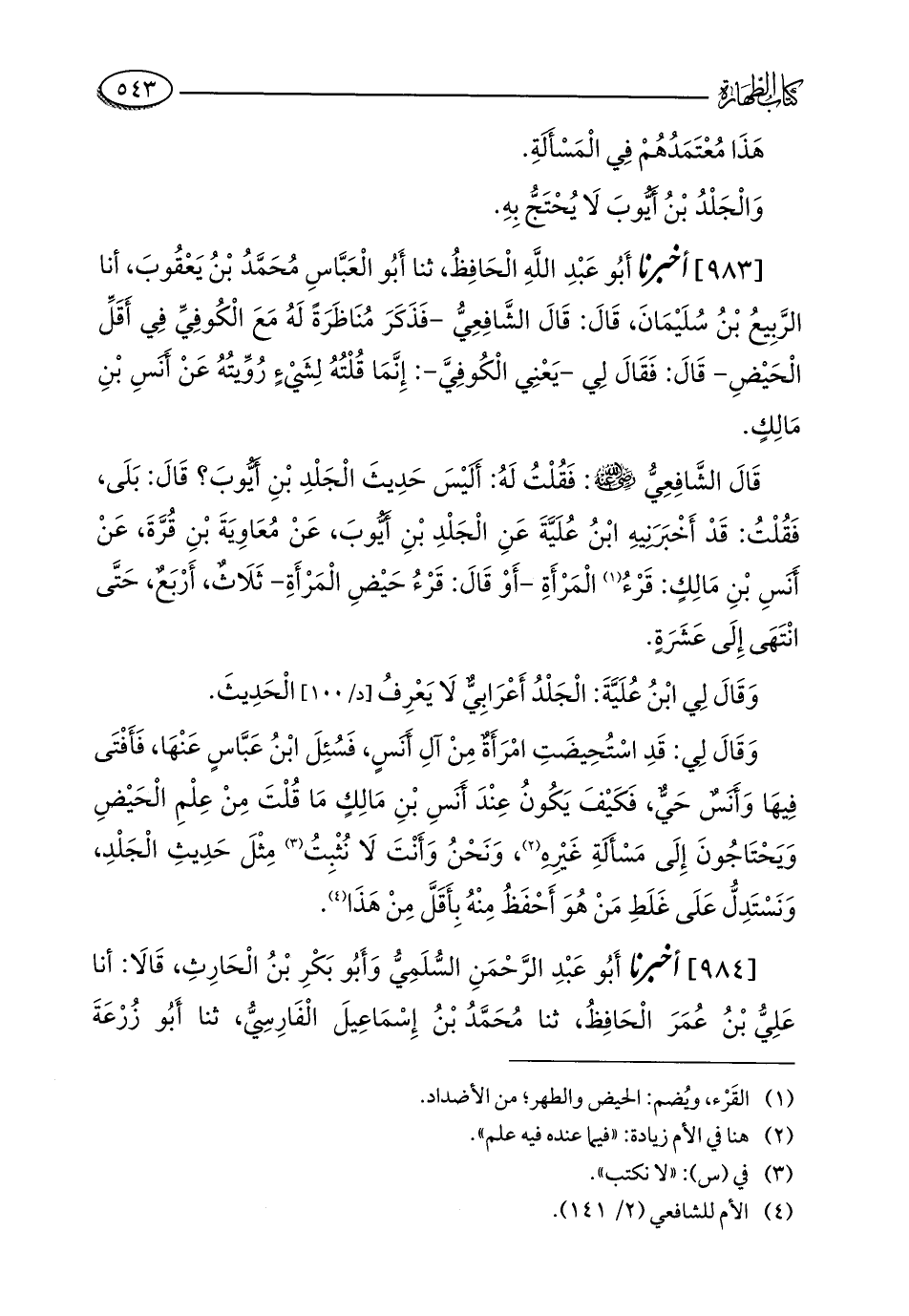 [983] أخبرنا أَبُو عَبْدِ اللَّهِ الْحَافِظُ، ثنا أَبُو الْعَبَّاسِ مُحَمَّدُ بْنُ يَعْقُوبَ، أنا الرَّبِيعُ بْنُ سُلَيْمَانَ، قَالَ: قَالَ الشَّافِعِيُّ - فَذَكَرَ مُنَاظَرَةً لَهُ مَعَ الْكُوفِيِّ فِي أَقَلِّ الْحَيْضِ - قَالَ: فَقَالَ لِي - يَعْنِي الْكُوفِيَّ -: إِنَّمَا قُلْتُهُ لِشَيْءٍ رُوِّيتُهُ عَنْ أَنَسِ بْنِ مَالِكٍ.