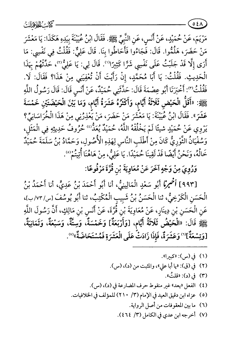 [993] أخبرنا أَبُو سَعْدٍ الْمَالينِيُّ، أنا أَبُو أَحْمَدَ بْنُ عَدِيٍّ، أنا أَحْمَدُ بْنُ الْحَسَنِ الْكَرْخِيُّ، ثنا الْحَسَنُ بْنُ شَبِيبٍ الْمُكْتِبُ، ثنا أَبُو يُوسُفَ، عَنِ الْحَسَنِ بْنِ دِينَارٍ، عَنْ مُعَاوِيَةَ بْنِ قُرَّةَ، عَنْ أَنَسِ بْنِ مَالِكٍ، أَنَّ رَسُولَ اللَّهِ - صلى الله عليه وسلم - قَالَ: "الْحَيْضُ ثَلَاثَةُ أَيَّامٍ، [وَأَرْبَعَةٌ] وَخَمْسَةٌ، وَسِتَّةٌ، وَسَبْعَةٌ، وَثَمَانِيَةٌ، [وَتِسْعَةٌ] (¬6) وَعَشَرَةٌ، فَإِذَا زَادَتْ عَلَى الْعَشَرَةِ فَمُسْتَحَاضَةٌ" (¬7).