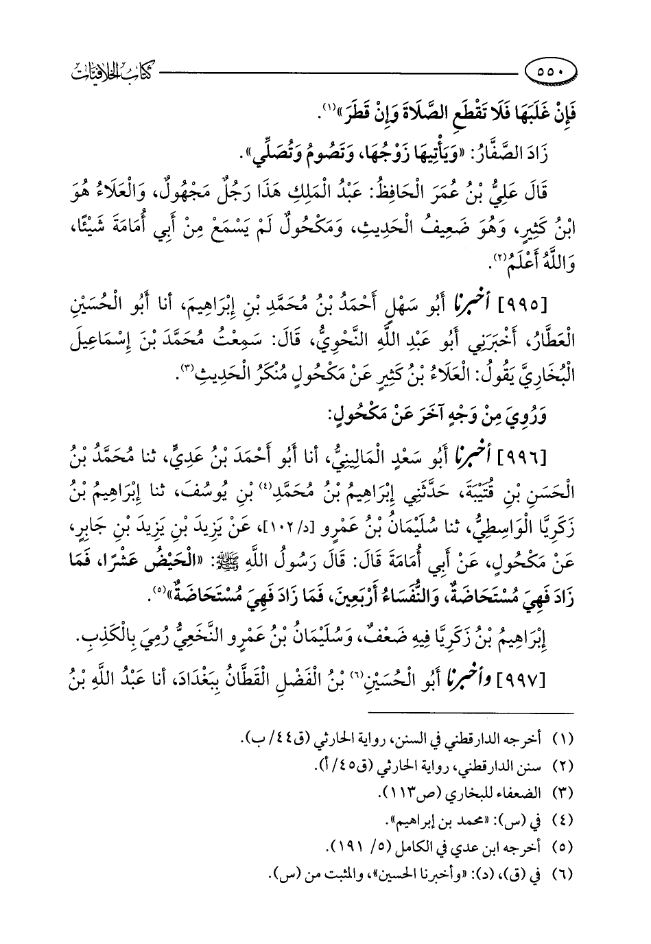 [995] أخبرنا أَبُو سَهْلٍ أَحْمَدُ بْنُ مُحَمَّدِ بْنِ إِبْرَاهِيمَ، أنا أَبُو الْحُسَيْنِ الْعَطَّارُ، أَخْبَرَني أَبُو عَبْدِ اللَّهِ النَّحْوِيُّ، قَالَ: سمِعْتُ مُحَمَّدَ بْنَ إِسْمَاعِيلَ الْبُخَارِيَّ يَقُولُ: الْعَلَاءُ بْنُ كَثِيرٍ عَنْ مَكْحُولٍ مُنْكَرُ الْحَدِيثِ (¬3).