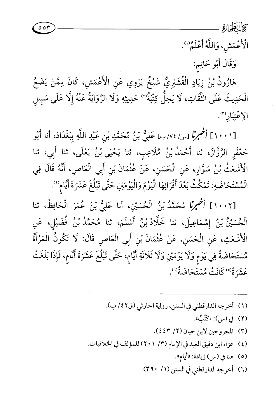 [1002] أخبرنا مُحَمَّدُ بْنُ الْحُسَيْنِ، أنا عَلِيُّ بْنُ عُمَرَ الْحَافِظُ، ثنا الْحُسَيْنُ بْنُ إِسْمَاعِيلَ، ثنا خَلَّادُ بْنُ أَسْلَمَ، ثنا مُحَمَّدُ بْنُ فُضَيْلٍ، عَنِ الْأَشْعَثِ، عَنِ الْحَسَنِ، عَنْ عُثْمَانَ بْنِ أَبِي الْعَاصِ قَالَ: لَا تَكُونُ الْمَرْأَةُ مُسْتَحَاضَةً فِي يَوْمٍ وَلَا يَوْمَيْنِ وَلَا ثَلَاثَةِ أَيَّامٍ، حَتَّى تَبْلُغَ عَشَرَةَ أَيَّامٍ، فَإِذَا بَلَغَتْ عَشَرَةً (¬5) كَانَتْ مُسْتَحَاضَةً (¬6).