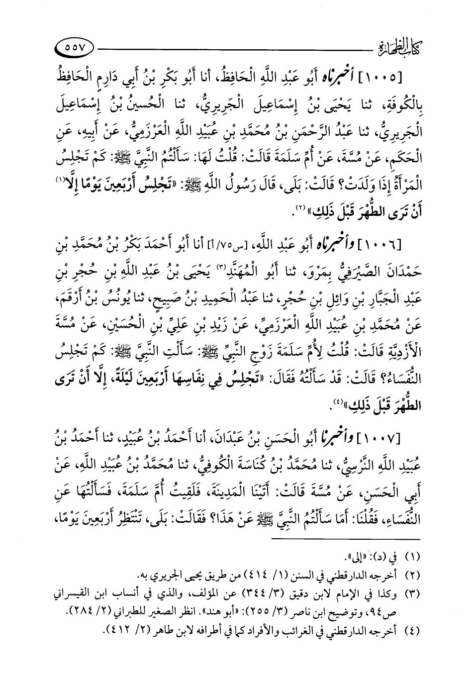 [1005] أخبرناه أَبُو عَبْدِ اللَّهِ الْحَافِظُ، أنا أَبُو بَكْرِ بْنُ أَبِي دَارِمٍ الْحَافِظُ بِالْكُوفَةِ، ثنا يَحْيَى بْنُ إِسْمَاعِيلَ الْجَرِيرِيُّ، ثنا الْحُسينُ بْنُ إِسْمَاعِيلَ الْجَرِيرِيُّ، ثنا عَبْدُ الرَّحْمَنِ بْنُ مُحَمَّدِ بْنِ عُبَيْدِ اللَّهِ الْعَرْزَمِيُّ، عَنْ أَبِيهِ، عَنِ الْحَكَمِ، عَنْ مُسَّةَ، عَنْ أُمِّ سَلَمَةَ قَالَتْ: قُلْتُ لَهَا: سَأَلْتُمُ النَّبِيَّ - صلى الله عليه وسلم -: كَمْ تَجْلِسُ الْمَرْأَةُ إِذَا وَلَدَتْ؟ قَالَتْ: بَلَى، قَالَ رَسُولُ اللَّهِ - صلى الله عليه وسلم -: "تَجْلِسُ أَرْبَعِينَ يَوْمًا إِلَّا (¬1) أَنْ تَرَى الطُّهْرَ قَبْلَ ذَلِكِ" (¬2).