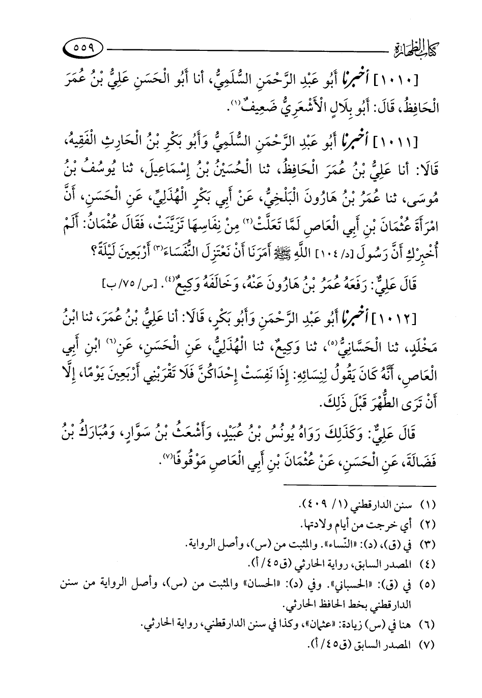 [1012] أخبرنا أَبُو عَبْدِ الرَّحْمَنِ وَأَبُو بَكْرٍ، قَالَا: أنا عَلِيُّ بْنُ عُمَرَ، ثنا ابْنُ مَخْلَدٍ، ثنا الْحَسَّانِيُّ (¬5)، ثنا وَكِيعٌ، ثنا الْهُذَلِيُّ، عَنِ الْحَسَنِ، عَنِ (¬6) ابْنِ أَبِي الْعَاصِ، أَنَّهُ كَانَ يَقُولُ لِنِسَائِهِ: إِذَا نَفِسَتْ إِحْدَاكُنَّ فَلَا تَقْرَبْنِي أَرْبَعِينَ يَوْمًا، إِلَّا أَنْ تَرَى الطُّهْرَ قَبْلَ ذَلِكَ.