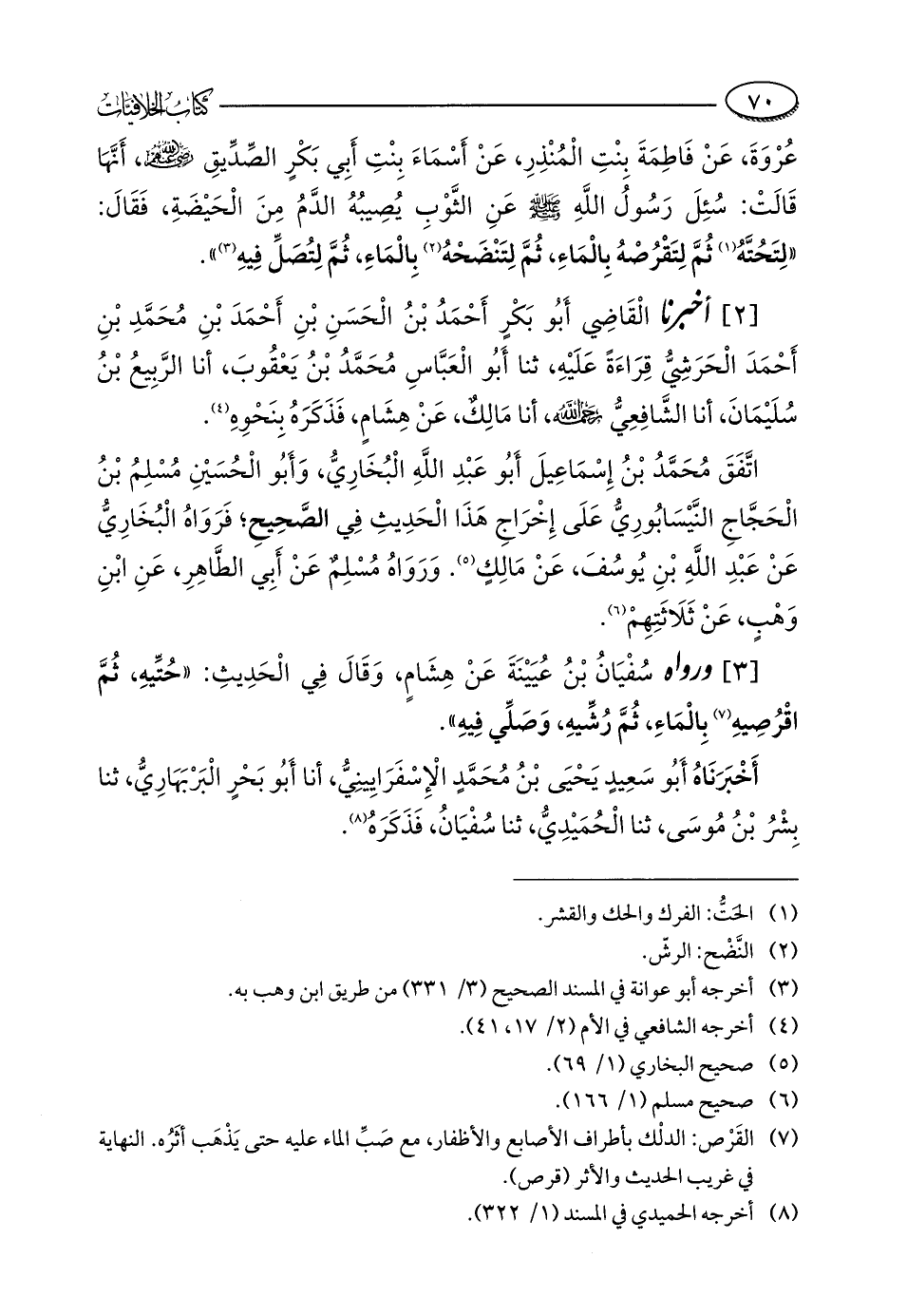 عُرْوَةَ، عَنْ فَاطِمَةَ بِنْتِ الْمُنْذِرِ، عَنْ أَسْمَاءَ بِنْتِ أَبِي بَكْرٍ الصِّدِّيقِ - رضي الله عنهم -، أَنَّهَا قَالَتْ: سُئِلَ رَسُولُ اللَّهِ - صلى الله عليه وسلم - عَنِ الثَّوْبِ يُصِيبُهُ الدَّمُ مِنَ الْحَيْضَةِ، فَقَالَ: "لِتَحُتَّهُ (¬1) ثُمَّ لِتَقْرُصْهُ بِالْمَاءِ، ثُمَّ لِتَنْضَحْهُ (¬2) بِالْمَاءِ، ثُمَّ لِتُصَلِّ فِيهِ (¬3) ".
