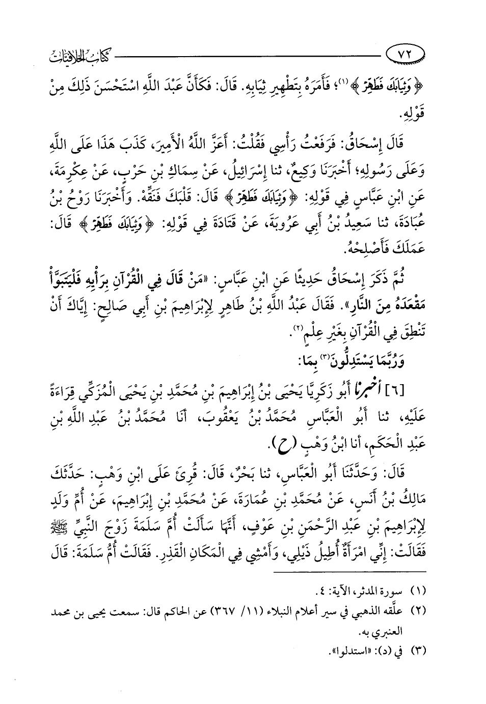 ثُمَّ ذَكَرَ إِسْحَاقُ حَدِيثًا عَنِ ابْنِ عَبَّاسٍ: "مَنْ قَالَ فِي الْقُرْآنِ بِرَأْيِهِ فَلْيَتَبَوَّأْ مَقْعَدَهُ مِنَ النَّارِ". فَقَالَ عَبْدُ اللَّهِ بْنُ طَاهِرٍ لِإِبْرَاهِيمَ بْنِ أَبِي صَالِحٍ: إِيَّاكَ أَنْ تَنْطِقَ فِي الْقُرْآنِ بِغَيْرِ عِلْمٍ (¬2).