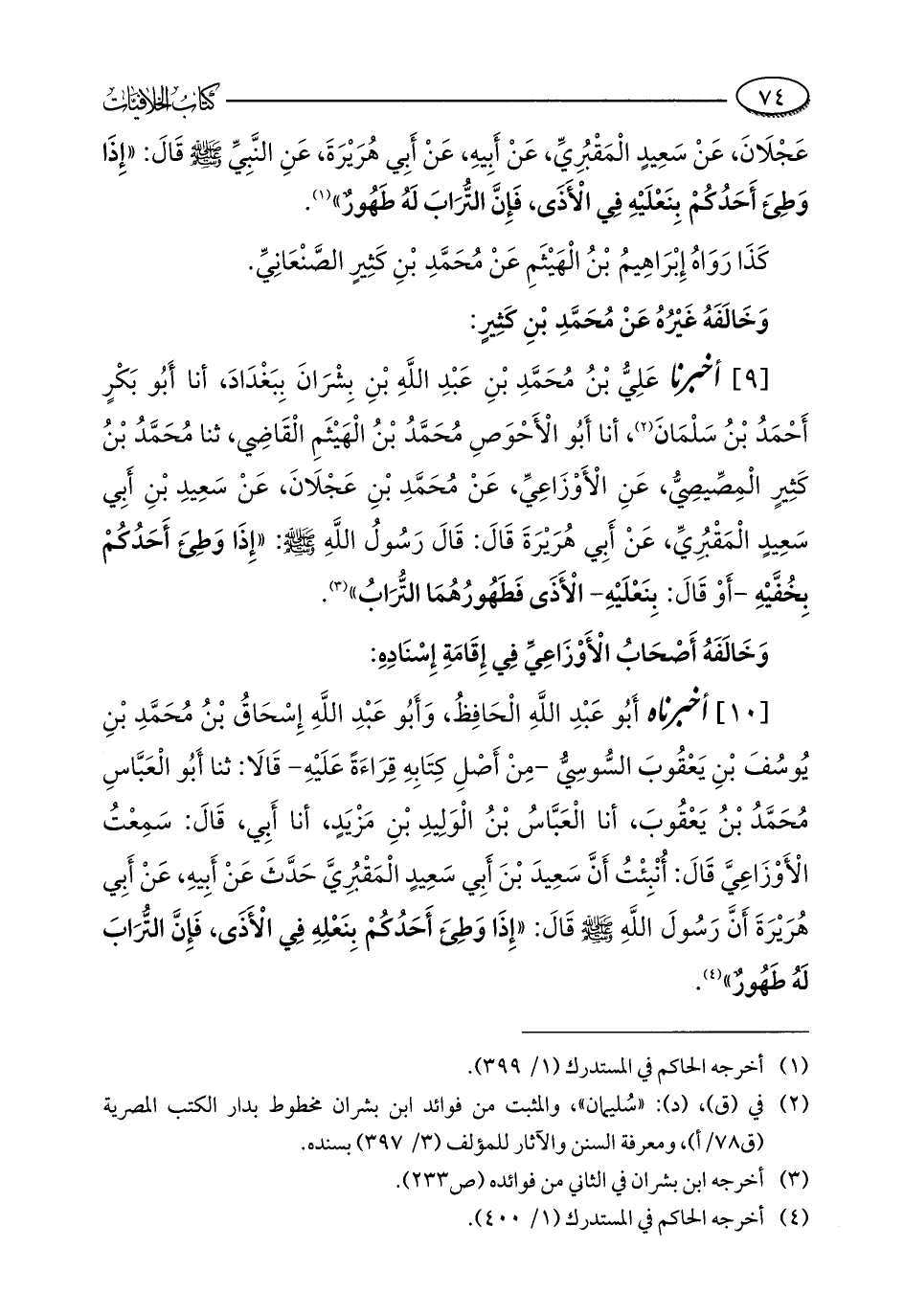 [9] أخبرنا عَلِيُّ بْنُ مُحَمَّدِ بْنِ عَبْدِ اللَّهِ بْنِ بِشْرَانَ بِبَغْدَادَ، أنا أَبُو بَكْرٍ أَحْمَدُ بْنُ سَلْمَانَ (¬2)، أنا أَبُو الْأَحْوَصِ مُحَمَّدُ بْنُ الْهَيْثَمِ الْقَاضِي، ثنا مُحَمَّدُ بْنُ كَثِيرٍ الْمِصِّيصِيُّ، عَنِ الْأَوْزَاعِيِّ، عَنْ مُحَمَّدِ بْنِ عَجْلَانَ، عَنْ سَعِيدِ بْنِ أَبِي سَعِيدٍ الْمَقْبُرِيِّ، عَنْ أَبِي هُرَيْرَةَ قَالَ: قَالَ رَسُولُ اللَّهِ - صلى الله عليه وسلم -: "إِذَا وَطِئَ أَحَدُكُمْ بِخُفَّيْهِ - أَوْ قَالَ: بِنَعْلَيْهِ - الْأَذَى فَطَهُورُهُمَا التُّرَابُ" (¬3).