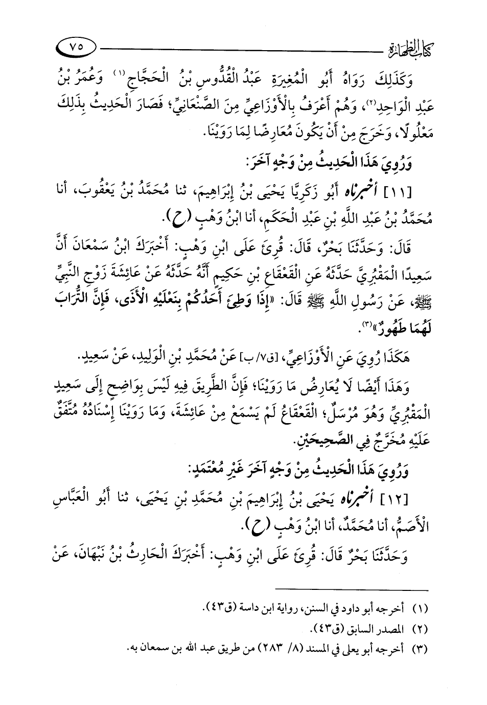قَالَ: وَحَدَّثَنَا بَحْرٌ، قَالَ: قُرِئَ عَلَى ابْنِ وَهْبٍ: أَخْبَرَكَ ابْنُ سَمْعَانَ أَنَّ سَعِيدًا الْمَقْبُرِيَّ حَدَّثَهُ عَنِ الْقَعْقَاعِ بْنِ حَكِيمٍ أَنَّهُ حَدَّثَهُ عَنْ عَائِشَةَ زَوْجِ النَّبِيِّ - صلى الله عليه وسلم -، عَنْ رَسُولِ اللَّهِ - صلى الله عليه وسلم - قَالَ: "إِذَا وَطِئَ أَحَدُكُمْ بِنَعْلَيْهِ الْأَذَى، فَإِنَّ التُّرَابَ لَهُمَا طَهُورٌ" (¬3).