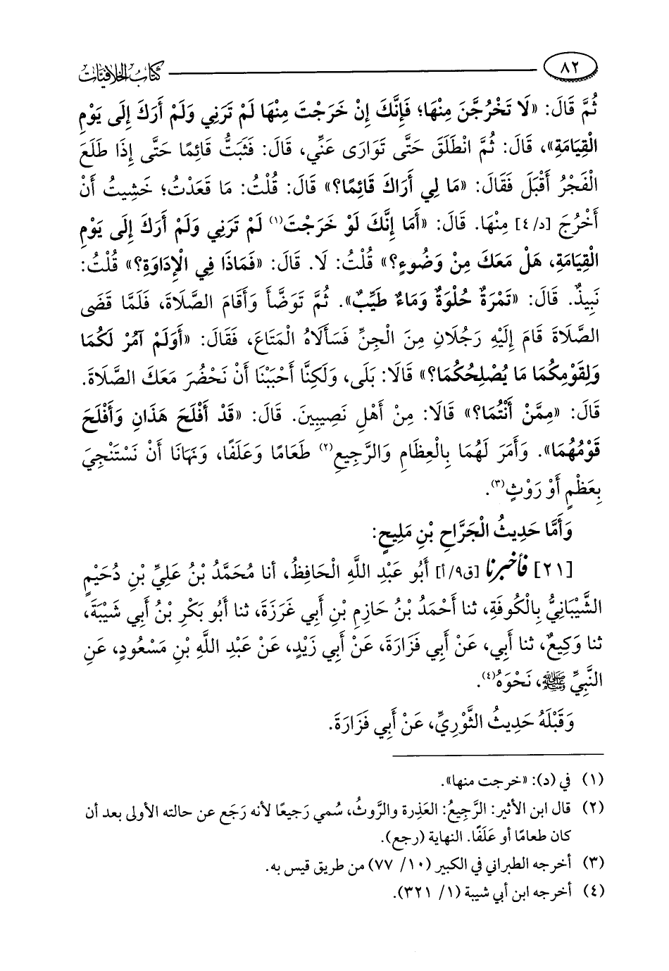 [21] فأخبرنا أَبُو عَبْدِ اللَّهِ الْحَافِظُ، أنا مُحَمَّدُ بْنُ عَلِيِّ بْنِ دُحَيْمٍ الشَّيْبَانِيُّ بِالْكُوفَةِ، ثنا أَحْمَدُ بْنُ حَازِمِ بْنِ أَبِي غَرَزَةَ، ثنا أَبُو بَكْرِ بْنُ أَبِي شَيْبَةَ، ثنا وَكِيعٌ، ثنا أَبِي، عَنْ أَبِي فَزَارَةَ، عَنْ أَبِي زَيْدٍ، عَنْ عَبْدِ اللَّهِ بْنِ مَسْعُودٍ، عَنِ النَّبِيِّ - صلى الله عليه وسلم -، نَحْوَهُ (¬4).