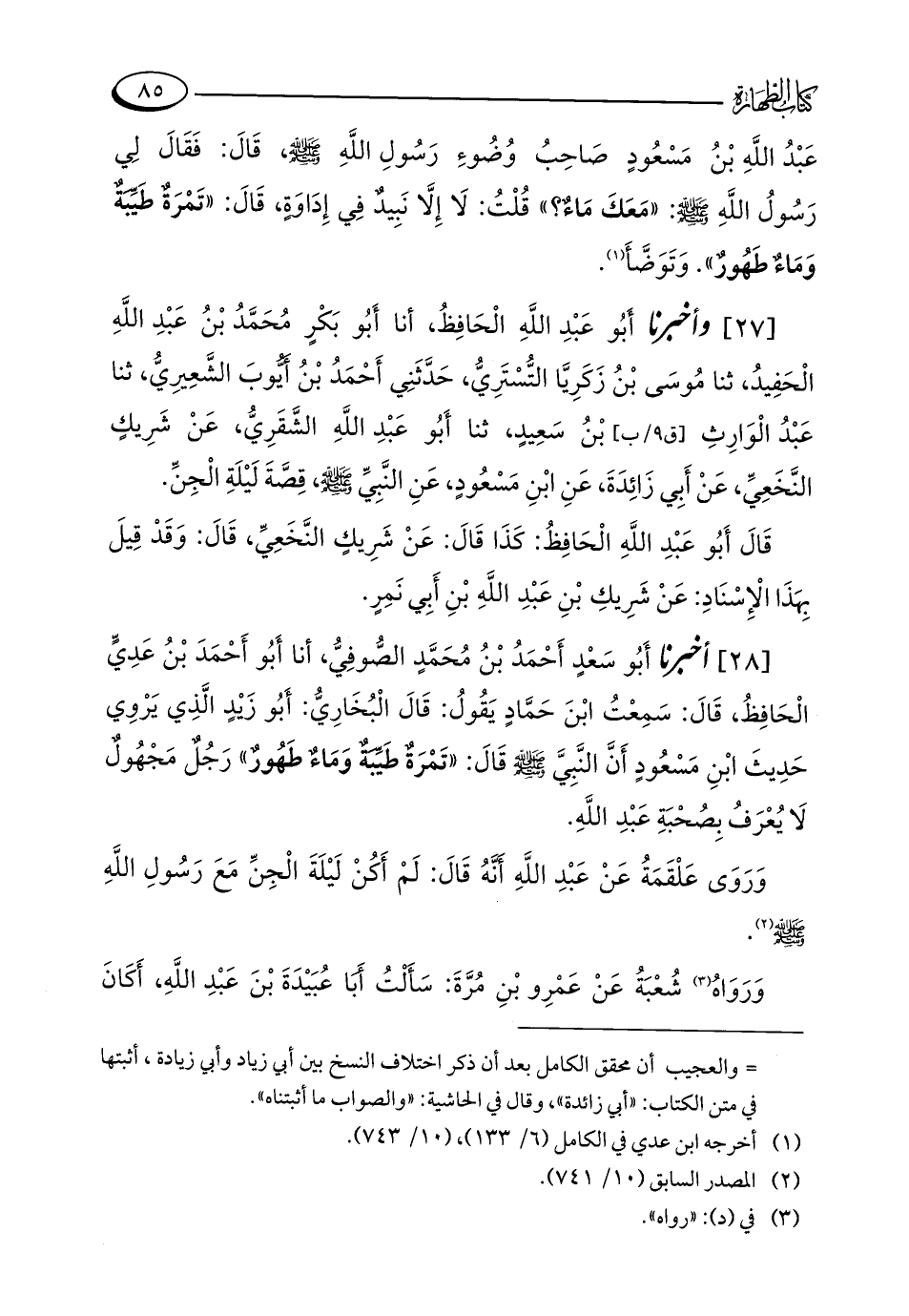 [28] أخبرنا أَبُو سَعْدٍ أَحْمَدُ بْنُ مُحَمَّدٍ الصُّوفِيُّ، أنا أَبُو أَحْمَدَ بْنُ عَدِيٍّ الْحَافِظُ، قَالَ: سَمِعْتُ ابْنَ حَمَّادٍ يَقُولُ: قَالَ الْبُخَارِيُّ: أَبُو زَيْدٍ الَّذِي يَرْوِي حَدِيثَ ابْنِ مَسْعُودٍ أَنَّ النَّبِيَّ - صلى الله عليه وسلم - قَالَ: "تَمْرَةٌ طَيِّبَةٌ وَمَاءٌ طَهُورٌ" رَجُلٌ مَجْهُولٌ لَا يُعْرَفُ بِصُحْبَةِ عَبْدِ اللَّهِ.