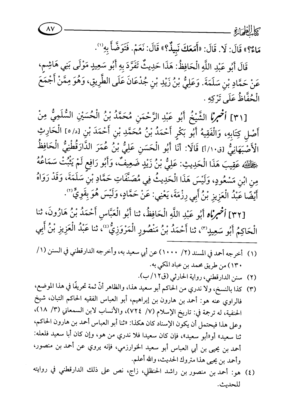 [31] أخبرنا الشَّيْخُ أَبُو عَبْدِ الرَّحْمَنِ مُحَمَّدُ بْنُ الْحُسَيْنِ السُّلَمِيُّ مِنْ أَصْلِ كِتَابِهِ، وَالْفَقِيهُ أَبُو بَكْرٍ أَحْمَدُ بْنُ مُحَمَّدِ بْنِ أَحْمَدَ بْنِ الْحَارِثِ الْأَصْبَهَانِيُّ قَالَا: أنَا أَبُو الْحَسَنِ عَلِيُّ بْنُ عُمَرَ الدَّارَقُطْنِيُّ الْحَافِظُ - رحمه الله - عَقِيبَ هَذَا الْحَدِيثِ: عَلِيُّ بْنُ زَيْدٍ ضَعِيفٌ، وَأَبُو رَافِعٍ لَمْ يَثْبُتْ سَمَاعُهُ مِنِ ابْنِ مَسْعُودٍ، وَلَيْسَ هَذَا الْحَدِيثُ فِي مُصَنَّفَاتِ حَمَّادِ بْنِ سَلَمَةَ، وَقَدْ رَوَاهُ أَيْضًا عَبْدُ الْعَزِيزِ بْنُ أَبِي رِزْمَةَ، يَعْنِي: عَنْ حَمَّادٍ، وَلَيْسَ هُوَ بِقَوِيٍّ (¬2).