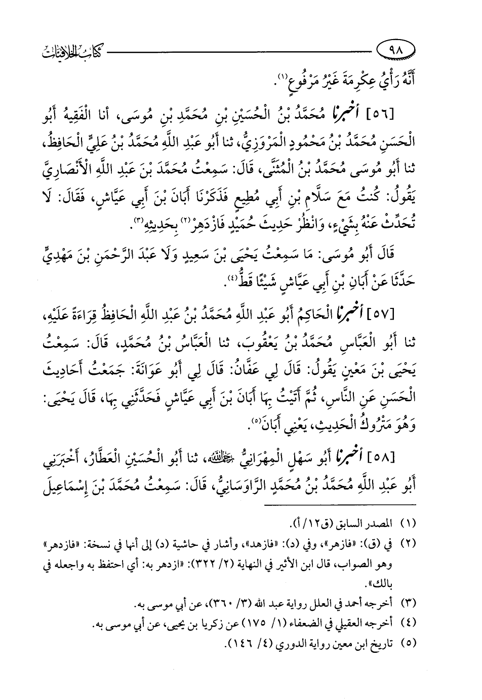[56] أخبرنا مُحَمَّدُ بْنُ الْحُسَيْنِ بْنِ مُحَمَّدِ بْنِ مُوسَى، أنا الْفَقِيهُ أَبُو الْحَسَنِ مُحَمَّدُ بْنُ مَحْمُودٍ الْمَرْوَزِيُّ، ثنا أَبُو عَبْدِ اللَّهِ مُحَمَّدُ بْنُ عَلِيٍّ الْحَافِظُ، ثنا أَبُو مُوسَى مُحَمَّدُ بْنُ الْمُثَنَّى، قَالَ: سَمِعْتُ مُحَمَّدَ بْنَ عَبْدِ اللَّهِ الْأَنْصَارِيَّ يَقُولُ: كُنتُ مَعَ سَلَّامِ بْنِ أَبِي مُطِيعٍ فَذَكَرْنَا أَبَانَ بْنَ أَبِي عَيَّاشٍ، فَقَالَ: لَا تُحَدِّثْ عَنْهُ بِشَيْءٍ، وَانْظُرْ حَدِيثَ حُمَيْدٍ فَازْدَهِرْ (¬2) بِحَدِيثِهِ (¬3).