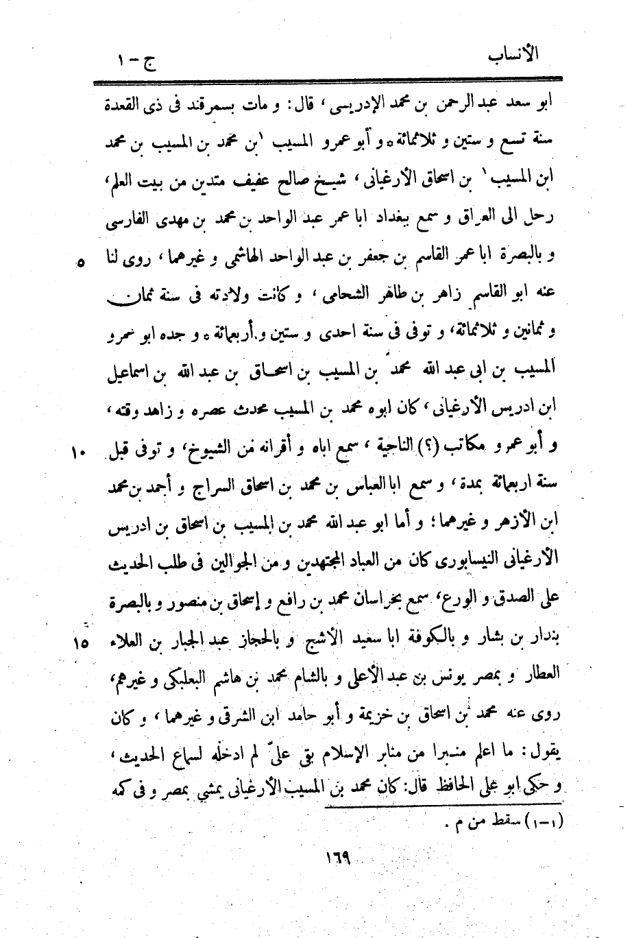 ابو سعد عبد الرحمن بن محمد الإدريسي، قال: ومات بسمرقند في ذي القعدة سنة تسع وستين وثلاثمائة وأبو عمرو المسيب [1] بن محمد بن المسيب بن محمد ابن المسيب [1] بن إسحاق الأرغياني، شيخ صالح عفيف متدين من بيت العلم، رحل الى العراق وسمع ببغداد ابا عمر عبد الواحد بن محمد بن مهدي الفارسي وبالبصرة ابا عمر القاسم بن جعفر بن عبد الواحد الهاشمي وغيرهما، روى لنا عنه ابو القاسم زاهر بن طاهر الشحامي، وكانت ولادته في سنة ثمان وثمانين وثلاثمائة، وتوفى في سنة احدى وستين وأربعمائة وجده ابو عمرو المسيب بن ابى عبد الله محمد بن المسيب بن إسحاق بن عبد الله بن إسماعيل ابن إدريس الأرغياني، كان أبوه محمد بن المسيب محدث عصره وزاهد وقته، وأبو عمرو مكاتب (؟) الناحية، سمع أباه وأقرانه من الشيوخ، وتوفى قبل سنة اربعمائة بمدة، وسمع ابا العباس بن محمد بن إسحاق السراج وأحمد بن محمد ابن الأزهر وغيرهما، وأما ابو عبد الله محمد بن المسيب بن إسحاق بن إدريس الأرغياني النيسابورىّ كان من العباد المجتهدين ومن الجوالين في طلب الحديث على الصدق والورع، سمع بخراسان محمد بن رافع وإسحاق بن منصور وبالبصرة بندار بن بشار وبالكوفة ابا سعيد الأشج وبالحجاز عبد الجبار بن العلاء العطار وبمصر يونس بن عبد الأعلى وبالشام محمد بن هاشم البعلبكي وغيرهم، روى عنه محمد بن إسحاق بن خزيمة وأبو حامد ابن الشرقي وغيرهما، وكان يقول: ما اعلم منبرا من منابر الإسلام بقي عليّ لم ادخله لسماع الحديث، وحكى ابو على الحافظ قال: كان محمد بن المسيب الأرغياني يمشى بمصر وفي كمه