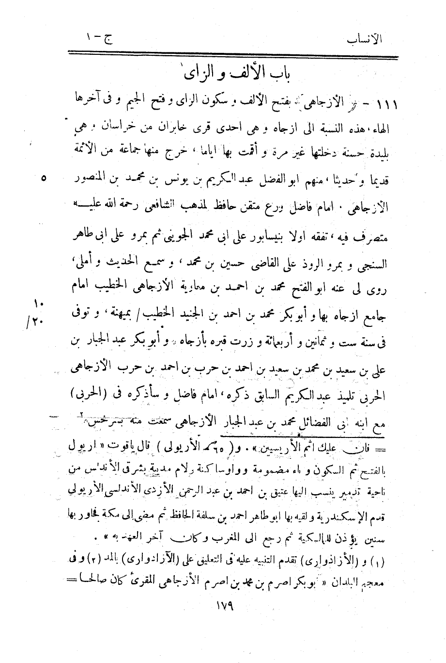 بفتح الألف وسكون الزاى وفتح الجيم وفي آخرها الهاء هذه النسبة الى أزجاه وهي احدى قرى خابران من خراسان وهي بليدة حسنة دخلتها غير مرة وأقمت بها أياما، خرج منها جماعة من الأئمة قديما وحديثا، منهم ابو الفضل عبد الكريم بن يونس بن محمد بن المنصور الأزجاهي. امام فاضل ورع متقن حافظ المذهب الشافعيّ رحمة الله عليه متصرف فيه، تفقه أولا بنيسابور على ابى محمد الجويني ثم بمرو على ابى طاهر السنجى وبمروالروذ على القاضي حسين بن محمد، وسمع الحديث وأملى، روى لي عنه ابو الفتح محمد بن احمد بن معاوية الأزجاهي الخطيب امام جامع أزجاه بها وأبو بكر محمد بن احمد بن الجنيد الخطيب/ بميهنة، وتوفى في سنة ست وثمانين وأربعمائة وزرت قبره بأزجاه وأبو بكر عبد الجبار بن على بن سعيد بن محمد بن سعيد بن احمد بن حرب بن احمد بن حرب الأزجاهي الحربي تلميذ عبد الكريم السابق ذكره، امام فاضل وسأذكره في (الحربي) مع ابنه ابى الفضائل محمد بن عبد الجبار الأزجاهي سمعت منه بسرخس [2]