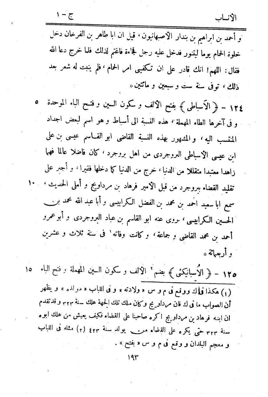 بفتح الألف وسكون السين وفتح الباء الموحدة وفي آخرها الطاء المهملة، هذه النسبة الى أسباط وهو اسم لبعض أجداد المنتسب اليه، والمشهور بهذه النسبة القاضي ابو القاسم عيسى بن على ابن عيسى الأسباطي البروجردي من أهل بروجرد، كان فاضلا عالما فهما زاهدا متعبدا متقللا من الدنيا، خرج من الدنيا كما دخلها فقيرا، وأجبر على تقليد القضاء ببروجرد من قبل الأمير فرهاد بن مرداويج وأملى الحديث، سمع ابا سعيد احمد بن محمد بن الفضل الكرابيسي وأبا عبد الله محمد بن الحسين الكرابيسي، روى عنه ابو القاسم بن عباد البروجردي وأبو عمرو أحمد بن محمد القاضي وجماعة، وكانت وفاته [1] في سنة ثلاث وعشرين وأربعمائة