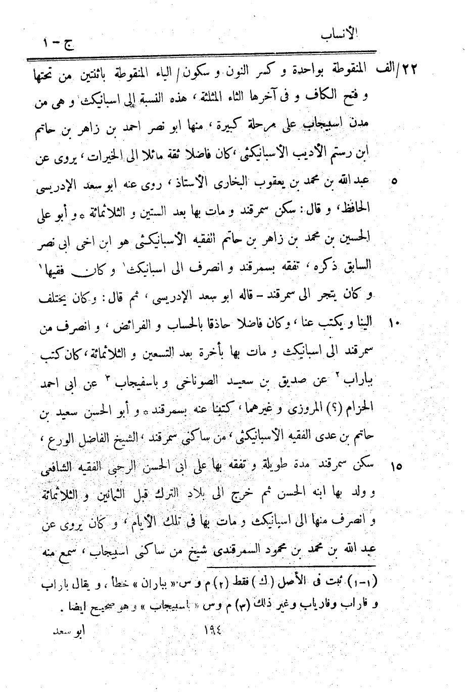 المنقوطة بواحدة وكسر النون وسكون/ الياء المنقوطة باثنتين من تحتها وفتح الكاف وفي آخرها الثاء المثلثة، هذه النسبة الى اسبانيكث وهي من مدن أسبيجاب على مرحلة كبيرة، منها ابو نصر احمد بن زاهر بن حاتم ابن رستم الأديب الأسبانيكثى، كان فاضلا ثقة مائلا الى الخيرات، يروى عن عبد الله بن محمد بن يعقوب البخاري الأستاذ، روى عنه ابو سعد الإدريسي الحافظ، وقال: سكن سمرقند ومات بها بعد الستين والثلاثمائة وأبو على الحسين بن محمد بن زاهر بن حاتم الفقيه الأسبانيكثى هو ابن أخي ابى نصر السابق ذكره، تفقه بسمرقند وانصرف الى اسبانيكث [1] وكان فقيها [1] وكان يتجر الى سمرقند- قاله ابو سعد الإدريسي، ثم قال: وكان يختلف إلينا ويكتب عنا، وكان فاضلا حاذقا بالحساب والفرائض، وانصرف من سمرقند الى اسبانيكث ومات بها بأخرة بعد التسعين والثلاثمائة، كان كتب بباراب [2] عن صديق بن سعيد الصوناخى وباسفيجاب [3] عن ابى احمد الحزام (؟) المروزي وغيرهما، كتبنا عنه بسمرقند وأبو الحسن سعيد بن حاتم بن عدي الفقيه الأسبانيكثي، من ساكني سمرقند، الشيخ الفاضل الورع، سكن سمرقند مدة طويلة وتفقه بها على ابى الحسن الرحبيّ الفقيه الشافعيّ وولد بها ابنه الحسن ثم خرج الى بلاد الترك قبل الثمانين والثلاثمائة وانصرف منها الى اسبانيكث ومات بها في تلك الأيام، وكان يروى عن عبد الله بن محمد بن محمود السمرقندي شيخ من ساكني أسبيجاب، سمع منه