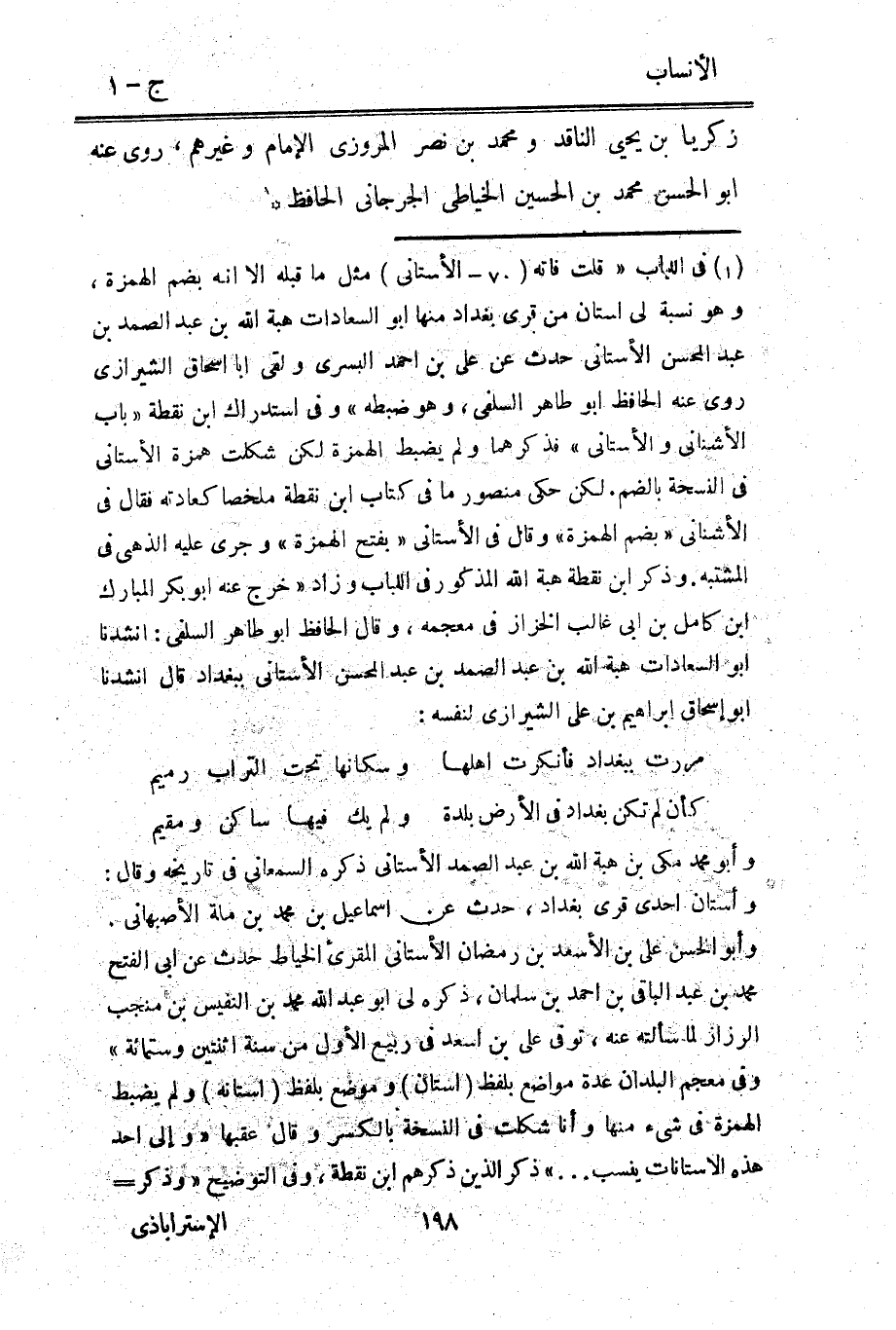 [1] في اللباب «قلت فإنه (70- الأستانى) مثل ما قبله الا انه بضم الهمزة، وهو نسبة لي استان من قرى بغداد منها ابو السعادات هبة الله بن عبد الصمد بن عبد المحسن الأستانى حدث عن على بن احمد البسري ولقي ابا إسحاق الشيرازي روى عنه الحافظ ابو طاهر السلفي، وهو ضبطه» وفي استدراك ابن نقطة «باب الأشناني والأستانى» فذكرهما ولم يضبط الهمزة لكن شكلت همزة الأستانى في النسخة بالضم. لكن حكى منصور ما في كتاب ابن نقطة ملخصا كعادته فقال في الأشناني «بضم الهمزة» وقال في الأستانى «بفتح الهمزة» وجرى عليه الذهبي في المشتبه. وذكر ابن نقطة هبة الله المذكور في اللباب وزاد «خرج عنه ابو بكر المبارك ابن كامل بن ابى غالب الخزاز في معجمه، وقال الحافظ ابو طاهر السلفي: أنشدنا ابو السعادات هبة الله بن عبد الصمد بن عبد المحسن الأستانى ببغداد قال أنشدنا ابو إسحاق إبراهيم بن على الشيرازي لنفسه: