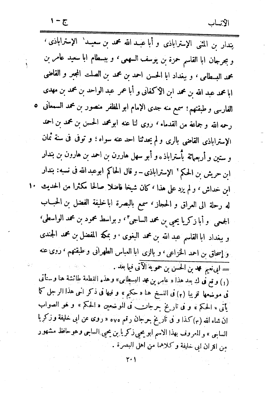 [3] كذا وفي تاريخ جرجان رقم 575 «روى عن ابى خليفة وزكريا الساجي» والمعروف بهذا الاسم ابو يحيى زكريا بن يحيى الساجي وهو حافظ مشهور من إقران ابى خليفة وكلاهما من أهل البصرة.