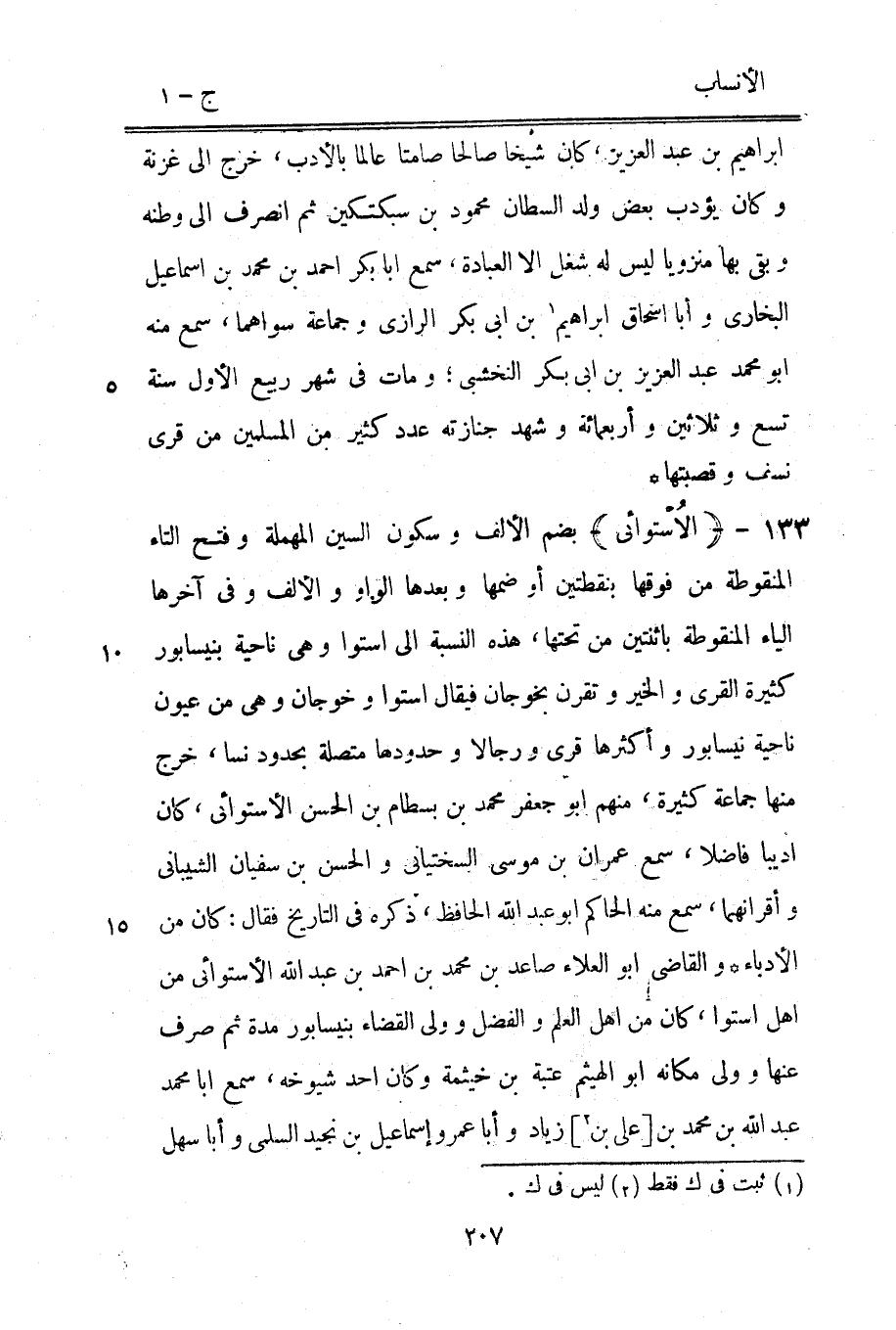 بضم الألف وسكون السين المهملة وفتح التاء المنقوطة من فوقها بنقطتين أو ضمها وبعدها الواو والألف وفي آخرها الياء المنقوطة باثنتين من تحتها، هذه النسبة الى استوار وهي ناحية بنيسابور كثيرة القرى والخير وتقرن بخوجان فيقال استوار وخوجان وهي من عيون ناحية نيسابور وأكثرها قرى ورجالا وحدودها متصلة بحدود نسا، خرج منها جماعة كثيرة، منهم ابو جعفر محمد بن بسطام بن الحسن الأستوائي، كان أديبا فاضلا، سمع عمران بن موسى السختياني والحسن بن سفيان الشيباني وأقرانهما، سمع منه الحاكم ابو عبد الله الحافظ، ذكره في التاريخ فقال: كان من الأدباء والقاضي ابو العلاء صاعد بن محمد بن احمد بن عبد الله الأستوائي من أهل استوا، كان من أهل العلم والفضل وولى القضاء بنيسابور مدة ثم صرف عنها وولى مكانه ابو الهيثم عتبة بن خيثمة وكان أحد شيوخه، سمع ابا محمد عبد الله بن محمد بن [على بن [2]] زياد وأبا عمرو إسماعيل بن نجيد السلمي وأبا سهل