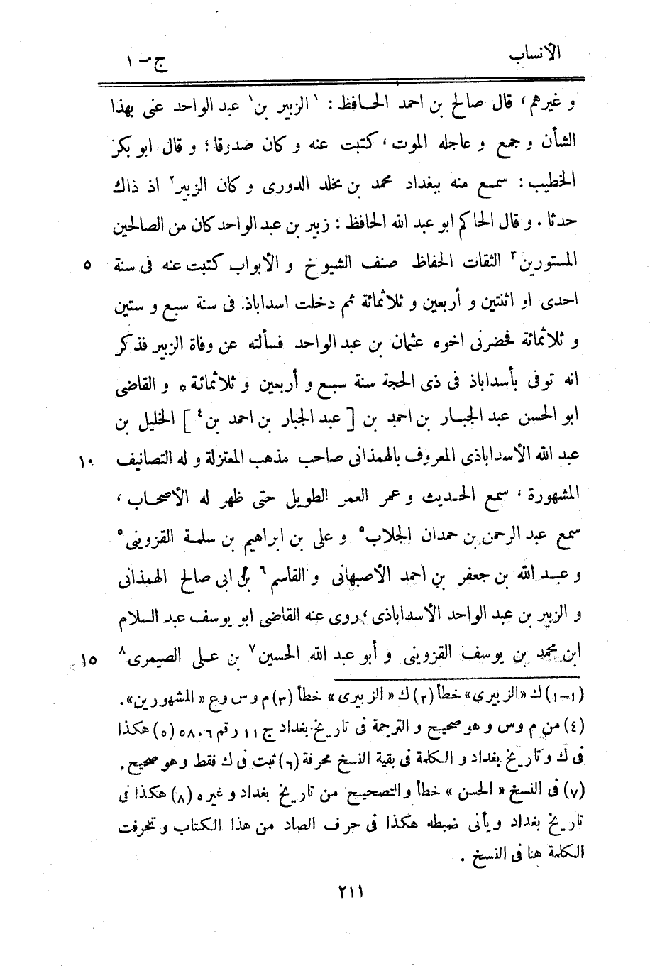 وغيرهم، قال صالح بن احمد الحافظ: [1] الزبير بن [1] عبد الواحد عنى بهذا الشأن وجمع وعاجله الموت، كتبت عنه وكان صدوقا، وقال ابو بكر الخطيب: سمع منه ببغداد محمد بن مخلد الدوري وكان الزبير [2] إذ ذاك حدثا. وقال الحاكم ابو عبد الله الحافظ: زبير بن عبد الواحد كان من الصالحين المستورين [3] الثقات الحفاظ صنف الشيوخ والأبواب كتبت عنه في سنة احدى أو اثنتين وأربعين وثلاثمائة ثم دخلت أسدآباذ في سنة سبع وستين وثلاثمائة فحضرني اخوه عثمان بن عبد الواحد فسألته عن وفاة الزبير فذكر انه توفى بأسدآباذ في ذي الحجة سنة سبع وأربعين وثلاثمائة والقاضي ابو الحسن عبد الجبار بن احمد بن [عبد الجبار بن احمد بن [4]] الخليل بن عبد الله الأسداباذي المعروف بالهمذانيّ صاحب مذهب المعتزلة وله التصانيف المشهورة، سمع الحديث وعمر العمر الطويل حتى ظهر له الأصحاب، سمع عبد الرحمن بن حمدان الجلاب [5] وعلى بن إبراهيم بن سلمة القزويني [5] وعبد الله بن جعفر بن احمد الأصبهاني والقاسم [6] بن ابى صالح الهمذانيّ والزبير بن عبد الواحد الأسداباذي، روى عنه القاضي ابو يوسف عبد السلام ابن محمد بن يوسف القزويني وأبو عبد الله الحسين [7] بن على الصيمري [8]