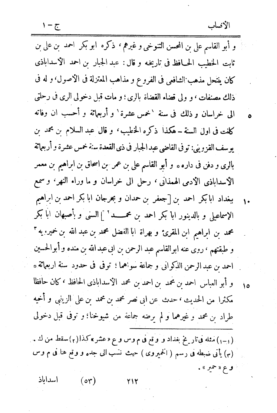 وأبو القاسم على بن المحسن التنوخي وغيرهم، ذكره ابو بكر احمد بن على بن ثابت الخطيب الحافظ في تاريخه وقال: عبد الجبار بن احمد الأسداباذي كان ينتحل مذهب الشافعيّ في الفروع ومذاهب المعتزلة في الأصول، وله في ذلك مصنفات، وولى قضاء القضاة بالري، ومات قبل دخولي الري في رحلتي الى خراسان وذلك في سنة [1] خمس عشرة [1] وأربعمائة وأحسب ان وفاته كانت في أول السنة- هكذا ذكره الخطيب، وقال عبد السلام بن محمد بن يوسف القزويني: توفى القاضي عبد الجبار في ذي القعدة سنة خمس عشرة وأربعمائة بالري ودفن في داره وأبو القاسم على بن عمر بن إسحاق بن إبراهيم بن معمر الأسداباذي الأدمي الهمذانيّ، رحل الى خراسان وما وراء النهر، وسمع ببغداد ابا بكر احمد بن [جعفر بن حمدان وبجرجان ابا بكر احمد بن إبراهيم الإسماعيلي وبالدينور ابا بكر احمد بن محمد [2]] السنى وبأصبهان ابا بكر محمد بن إبراهيم ابن المقرئ وبهراة ابا الفضل محمد بن عبد الله بن خميرويه [3] وطبقتهم، روى عنه ابو القاسم عبد الرحمن بن ابى عبد الله بن مندة وأبو الحسين احمد بن عبد الرحمن الذكوانيّ وجماعة سواهما، توفى في حدود سنة اربعمائة وأبو العباس احمد بن محمد بن احمد بن محمد الأسداباذي الحافظ، كان حافظا مكثرا من الحديث، حدث عن ابى نصر محمد بن محمد بن على الزينبي وأخيه طراد بن محمد وغيرهما ولم يرضه وجماعة من شيوخنا، وتوفى قبل دخولي