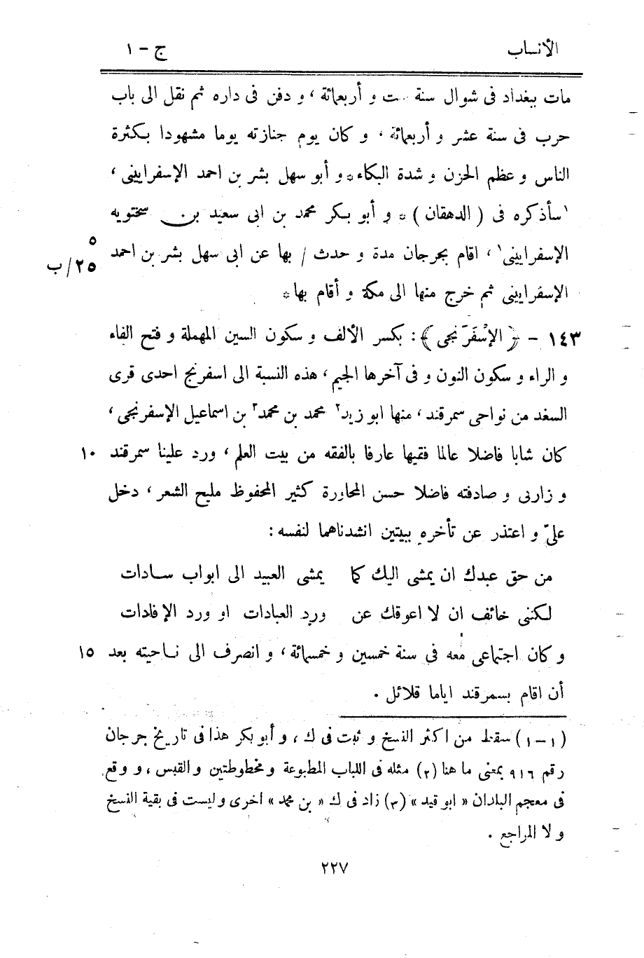 بكسر الألف وسكون السين المهملة وفتح الفاء والراء وسكون النون وفي آخرها الجيم، هذه النسبة الى اسفرنج احدى قرى السغد من نواحي سمرقند، منها ابو زيد [2] محمد بن محمد [3] بن إسماعيل الإسفرنجى، كان شابا فاضلا عالما فقيها عارفا بالفقه من بيت العلم، ورد علينا سمرقند وزارني وصادفته فاضلا حسن المحاورة كثير المحفوظ مليح الشعر، دخل على واعتذر عن تأخيره ببيتين انشدناهما لنفسه: