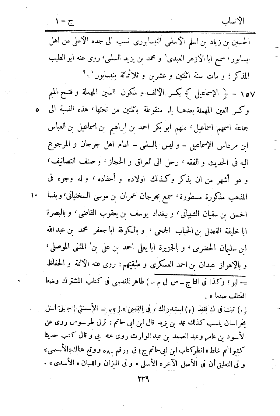 بكسر الألف وسكون السين المهملة وفتح الميم وكسر العين المهملة بعدها ياء منقوطة باثنتين من تحتها، هذه النسبة الى جماعة اسمهم إسماعيل، منهم ابو بكر احمد بن إبراهيم بن إسماعيل بن العباس ابن مرداس الإسماعيلي- وليس بالسلمى- امام أهل جرجان والمرجوع اليه في الحديث والفقه، رحل الى العراق والحجاز، وصنف التصانيف، وهو أشهر من ان يذكر وكذلك أولاده وأحفاده، وله وجوه في المذهب مذكورة مسطورة، سمع بجرجان عمران بن موسى السختياني، وبنسا الحسن بن سفيان الشيباني، وببغداد يوسف بن يعقوب القاضي، وبالبصرة ابا خليفة الفضل بن الحباب الجمحيّ، وبالكوفة ابا جعفر محمد بن عبد الله ابن سليمان الحضرميّ، وبالجزيرة ابا يعلى احمد بن على بن [1] المثنى الموصلي، وبالأهواز عبدان بن احمد العسكري وطبقتهم، روى عنه الأئمة والحفاظ