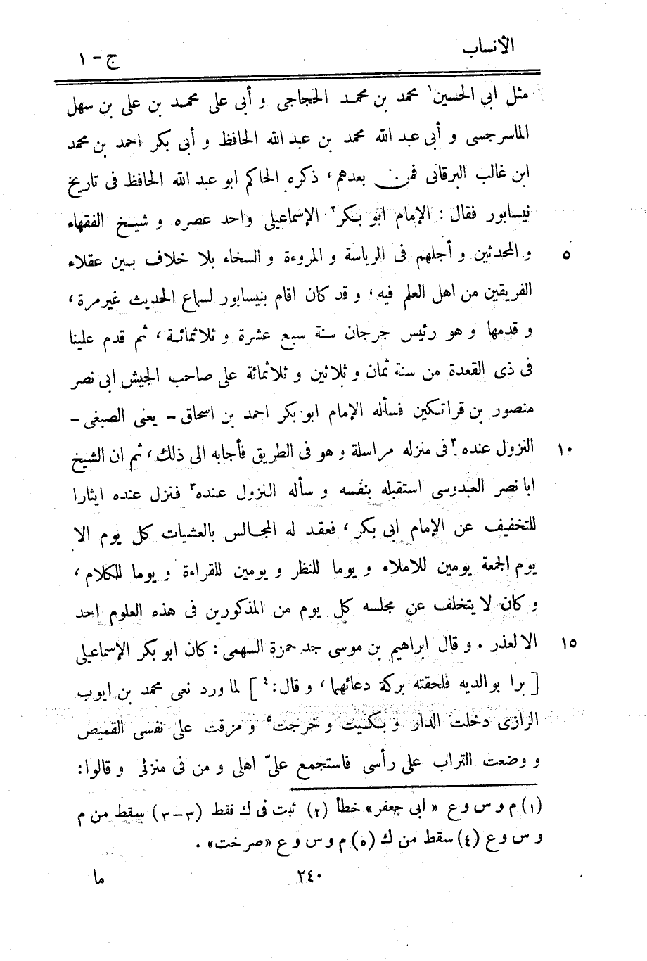 مثل ابى الحسين [1] محمد بن محمد الحجاجى وأبى على محمد بن على بن سهل الماسرجسي وأبى عبد الله محمد بن عبد الله الحافظ وأبى بكر احمد بن محمد ابن غالب البرقاني فمن بعدهم، ذكره الحاكم ابو عبد الله الحافظ في تاريخ نيسابور فقال: الإمام ابو بكر [2] الإسماعيلي واحد عصره وشيخ الفقهاء والمحدثين وأجلهم في الرئاسة والمروءة والسخاء بلا خلاف بين عقلاء الفريقين من أهل العلم فيه، وقد كان اقام بنيسابور لسماع الحديث غير مرة، وقدمها وهو رئيس جرجان سنة سبع عشرة وثلاثمائة، ثم قدم علينا في ذي القعدة من سنة ثمان وثلاثين وثلاثمائة على صاحب الجيش ابى نصر منصور بن قراتكين فسأله الإمام ابو بكر احمد بن إسحاق- يعنى الصبغى- النزول عنده [3] في منزله مراسلة وهو في الطريق فأجابه الى ذلك، ثم ان الشيخ ابا نصر العبدوسى استقبله بنفسه وسأله النزول عنده [3] فنزل عنده إيثارا للتخفيف عن الإمام ابى بكر، فعقد له المجالس بالعشيات كل يوم الا يوم الجمعة يومين للاملاء ويوما للنظر ويومين للقراءة ويوما للكلام، وكان لا يتخلف عن مجلسه كل يوم من المذكورين في هذه العلوم أحد الا لعذر. وقال إبراهيم بن موسى جد حمزة السهمي: كان ابو بكر الإسماعيلي [برا بوالديه فلحقته بركة دعائهما، وقال: [4]] لما ورد نعى محمد بن أيوب الرازيّ دخلت الدار وبكيت وخرجت [5] ومزقت على نفسي القميص ووضعت التراب على رأسي فاستجمع عليّ أهلي ومن في منزلي وقالوا: