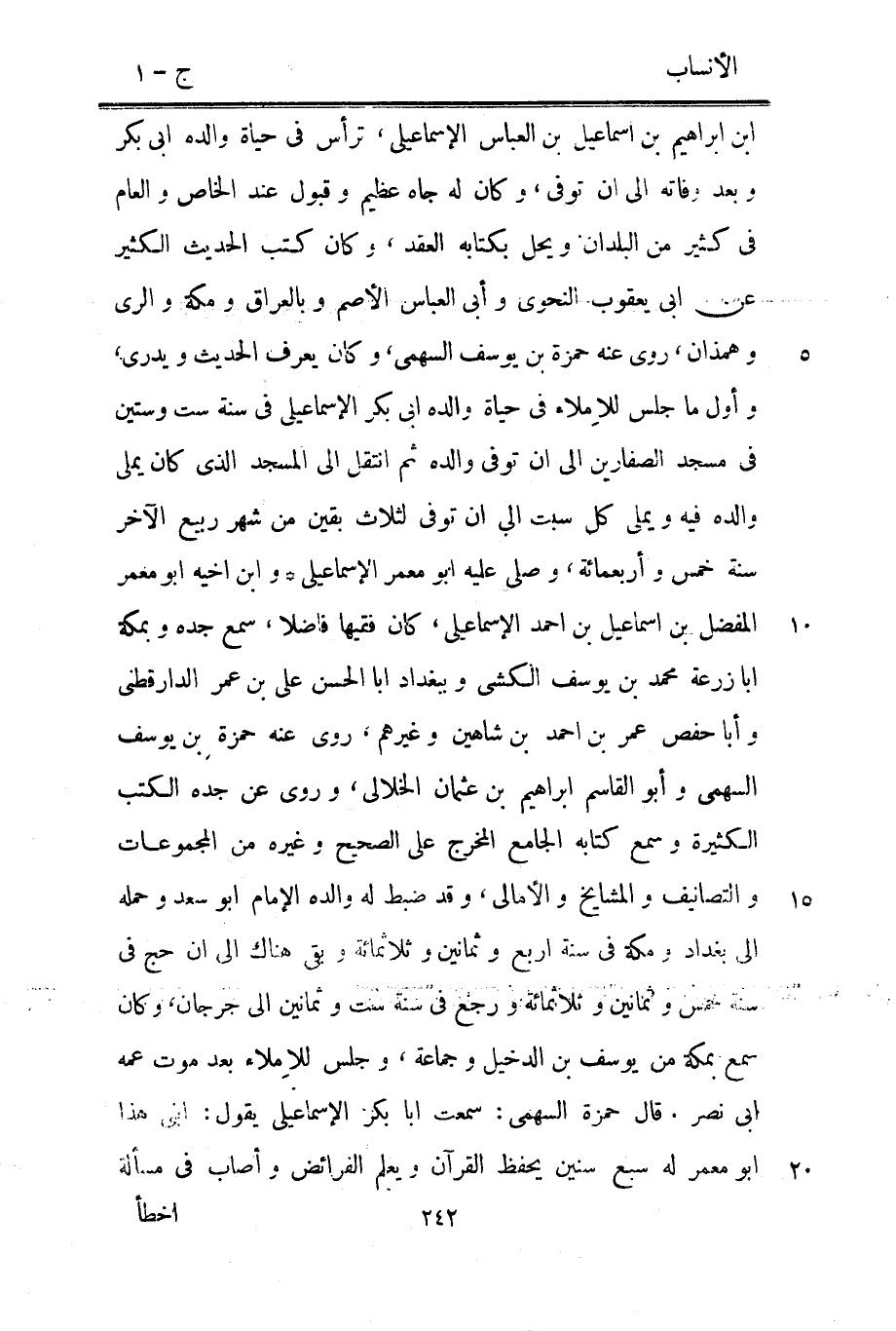 ابن إبراهيم بن إسماعيل بن العباس الإسماعيلي، ترأس في حياة والده ابى بكر وبعد وفاته الى ان توفى، وكان له جاه عظيم وقبول عند الخاص والعام في كثير من البلدان ويحل بكتابه العقد، وكان كتب الحديث الكثير عن ابى يعقوب النحويّ وأبى العباس الأصم وبالعراق ومكة والري وهمذان، روى عنه حمزة بن يوسف السهمي، وكان يعرف الحديث ويدرى، وأول ما جلس للاملاء في حياة والده ابى بكر الإسماعيلي في سنة ست وستين في مسجد الصفارين الى ان توفى والده ثم انتقل الى المسجد الّذي كان يملى والده فيه ويملى كل سبت الى ان توفى لثلاث بقين من شهر ربيع الآخر سنة خمس وأربعمائة، وصلى عليه ابو معمر الإسماعيلي وابن أخيه ابو معمر المفضل بن إسماعيل بن احمد الإسماعيلي، كان فقيها فاضلا، سمع جده وبمكة ابا زرعة محمد بن يوسف الكشي وببغداد ابا الحسن على بن عمر الدارقطنيّ وأبا حفص عمر بن احمد بن شاهين وغيرهم، روى عنه حمزة بن يوسف السهمي وأبو القاسم إبراهيم بن عثمان الخلالى، وروى عن جده الكتب الكثيرة وسمع كتابه الجامع المخرج على الصحيح وغيره من المجموعات والتصانيف والمشايخ والأمالي، وقد ضبط له والده الإمام ابو سعد وحمله الى بغداد ومكة في سنة اربع وثمانين وثلاثمائة وبقي هناك الى ان حج في سنة خمس وثمانين وثلاثمائة ورجع في سنة ست وثمانين الى جرجان، وكان سمع بمكة من يوسف بن الدخيل وجماعة، وجلس للاملاء بعد موت عمه ابى نصر. قال حمزة السهمي: سمعت ابا بكر الإسماعيلي يقول: ابني هذا ابو معمر له سبع سنين يحفظ القرآن ويعلم الفرائض وأصاب في مسألة