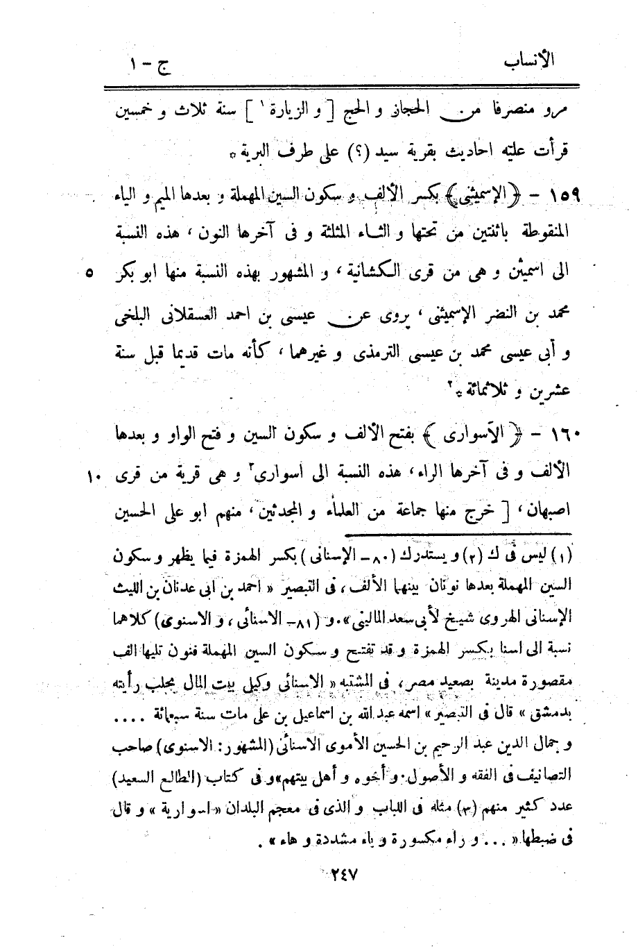 [2] ويستدرك (80- الإسناني) بكسر الهمزة فيما يظهر وسكون السين المهملة بعدها نونان بينهما الألف، في التبصير «احمد بن ابى عدنان بن الليث الإسناني الهروي شيخ لأبى سعد الماليني» . و (81- الاسنائى، والاسنوى) كلاهما نسبة الى اسنا بكسر الهمزة وقد تفتح وسكون السين المهملة فنون تليها ألف مقصورة مدينة بصعيد مصر، في المشتبه «الاسنائى وكيل بيت المال بحلب رأيته بدمشق» قال في التبصير» اسمه عبد الله بن إسماعيل بن على مات سنة سبعمائة ...