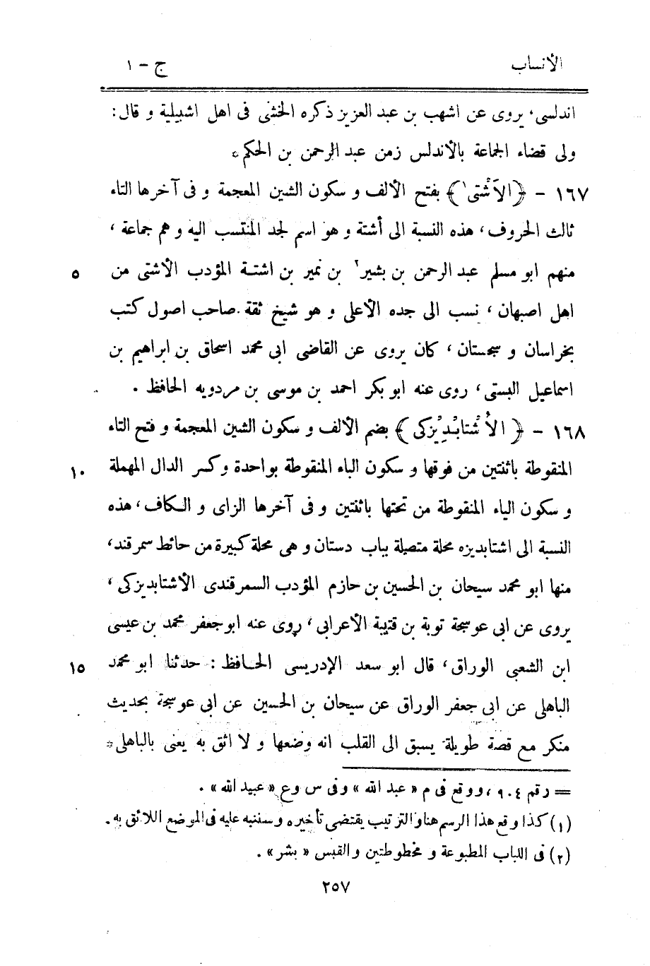 بفتح الألف وسكون الشين المعجمة وفي آخرها التاء ثالث الحروف، هذه النسبة الى أشتة وهو اسم لجد المنتسب اليه وهم جماعة، منهم ابو مسلم عبد الرحمن بن بشير [2] بن نمير بن اشتة المؤدب الأشتى من أهل أصبهان، نسب الى جده الأعلى وهو شيخ ثقة صاحب أصول كتب بخراسان وسجستان، كان يروى عن القاضي ابى محمد إسحاق بن إبراهيم بن إسماعيل البستي، روى عنه ابو بكر احمد بن موسى بن مردويه الحافظ.