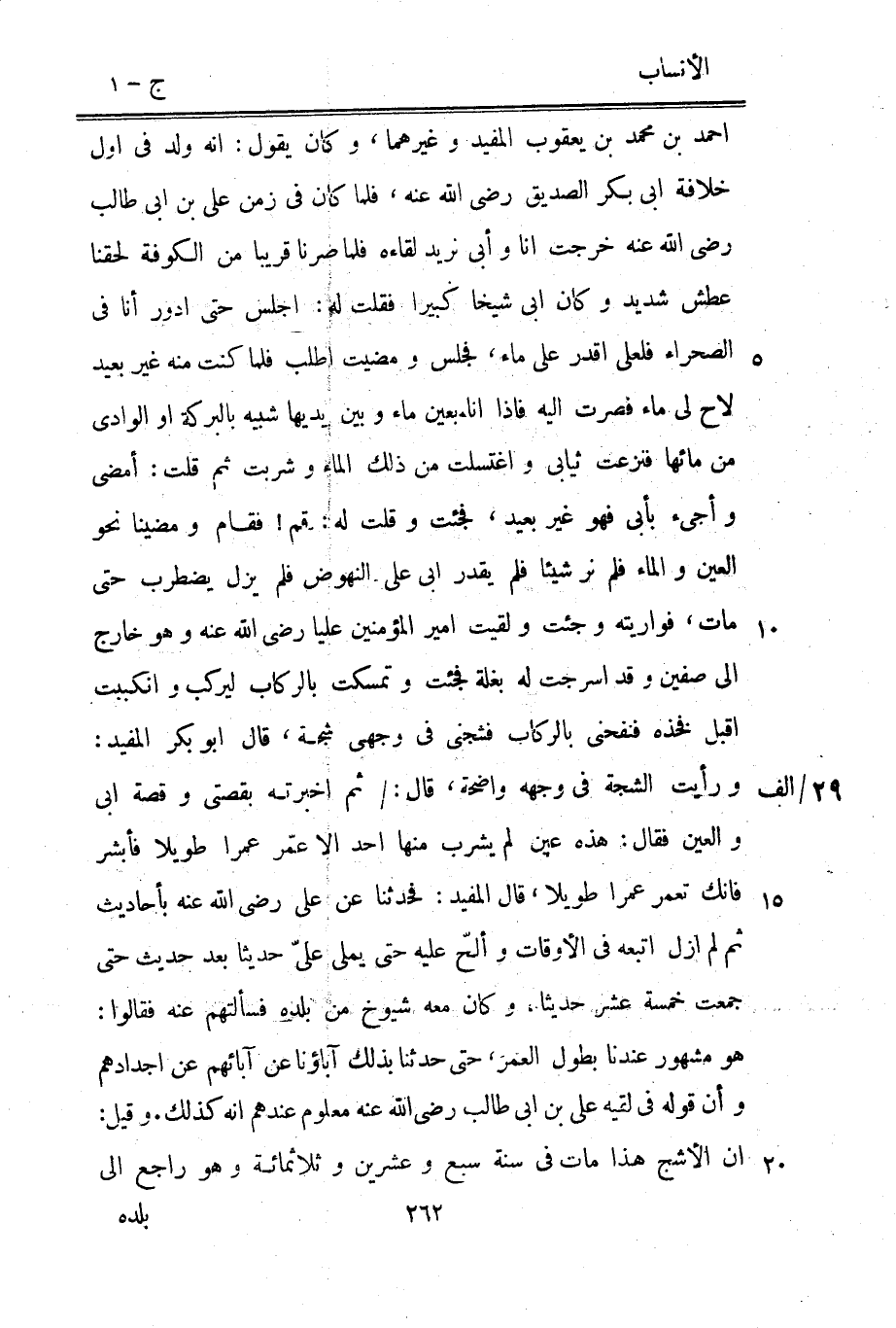 ورأيت الشجة في وجهه واضحة، قال:/ ثم أخبرته بقصتي وقصة ابى والعين فقال: هذه عين لم يشرب منها أحد الا عمّر عمرا طويلا فأبشر فإنك تعمر عمرا طويلا، قال المفيد: فحدثنا عن على رضى الله عنه بأحاديث ثم لم أزل اتبعه في الأوقات وألحّ عليه حتى يملى على حديثا بعد حديث حتى جمعت خمسة عشر حديثا، وكان معه شيوخ من بلده فسألتهم عنه فقالوا: